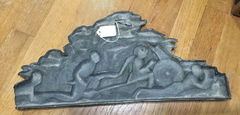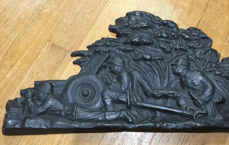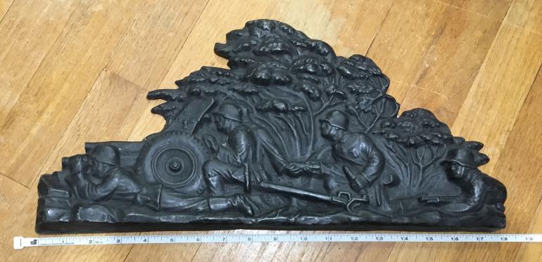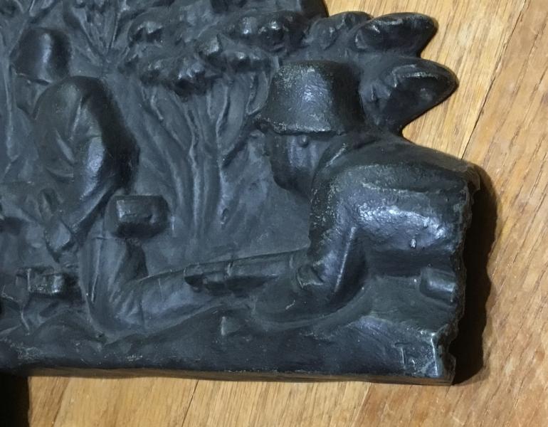This Plaque is a scene of a complete section of soldiers firing an small bore early artillery piece. What is different this plaque is cast iron and very heavy quite different than my bronze statues. The right side has a soldier laying down holding a rifle. If you look close you can tell at one time there was more of him and it looks like about on Inch or more was broken off. I presume that happen when it was token off whatever it was mounted on.I originally hesitated buying it and then said to myself that this was a great piece with typical German detail. Then have I ever seen another one NO! With all my friends looking at it I had to tell them about the missing right side end of the plaque. The makers name appears to have been on the missing part with just one letter remaining. Just makes a great display piece.