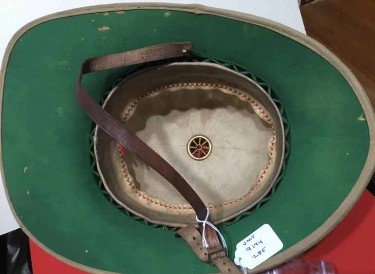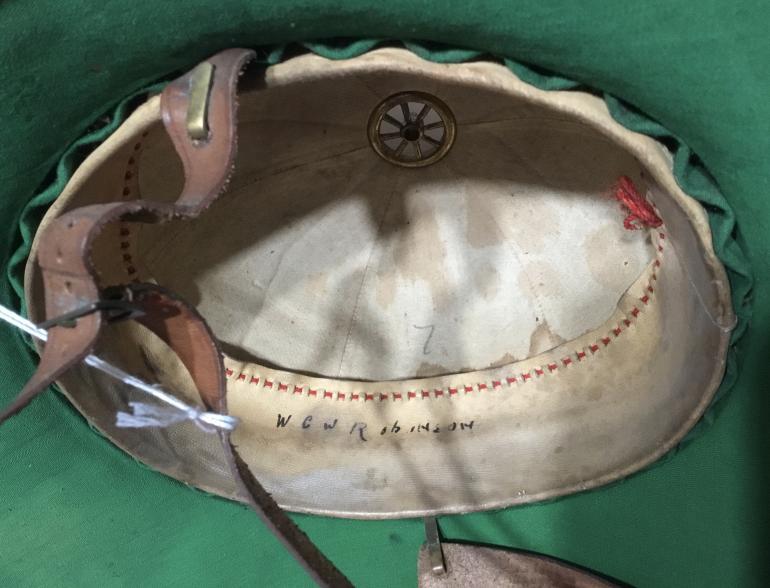 Just purchased this from the grandson of a WWI British Veteran and I have to admit its the first British Pith helmet I have ever bought. This Wolseley Patter Sun Helmet called a TOPI by the British soldiers is constructed of Cork covered by cloth. The top is made of six panels and has the typical vent on the top. On this helmet the top of the adjustable vent is missing looks just like the WWII German Pith helmet top. The helmet itself is in very good shape the rear apron cork needs to be flatten out and can be accomplished as the cork is still flexible. The decorative cap band is complete and really adds a lot to the overall looks of the helmet. The underside of the apron has a green felt material that the moths have takes some nips out of it. The Chin strap is omplete on the original brass hooks. The leather sweat bank is in exceptional shape with the interwoven red thread that appears to be the only adjustment for head size. His grandfathers name is inked on the sweat band W.C.W. Robinson.