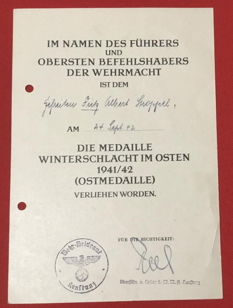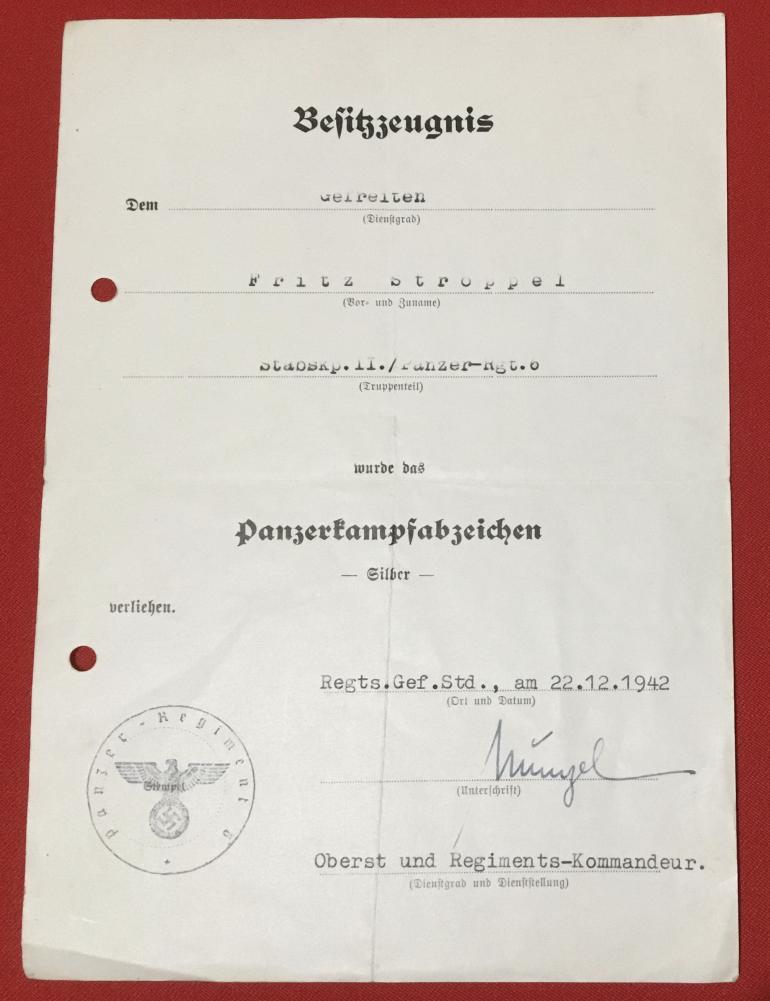 Documents include A-Winter Campaign Russia awarded Sept. 24, 1942 Gefriten Fritz Stroppel Stabskp. B- Tank Battle Badge Silver. To Gefreiten Fritz Stroppel Stabskp. II./ Panzer-Rgt. 6. Circular stamp on lower left of the document list Panzer Regiment 6.