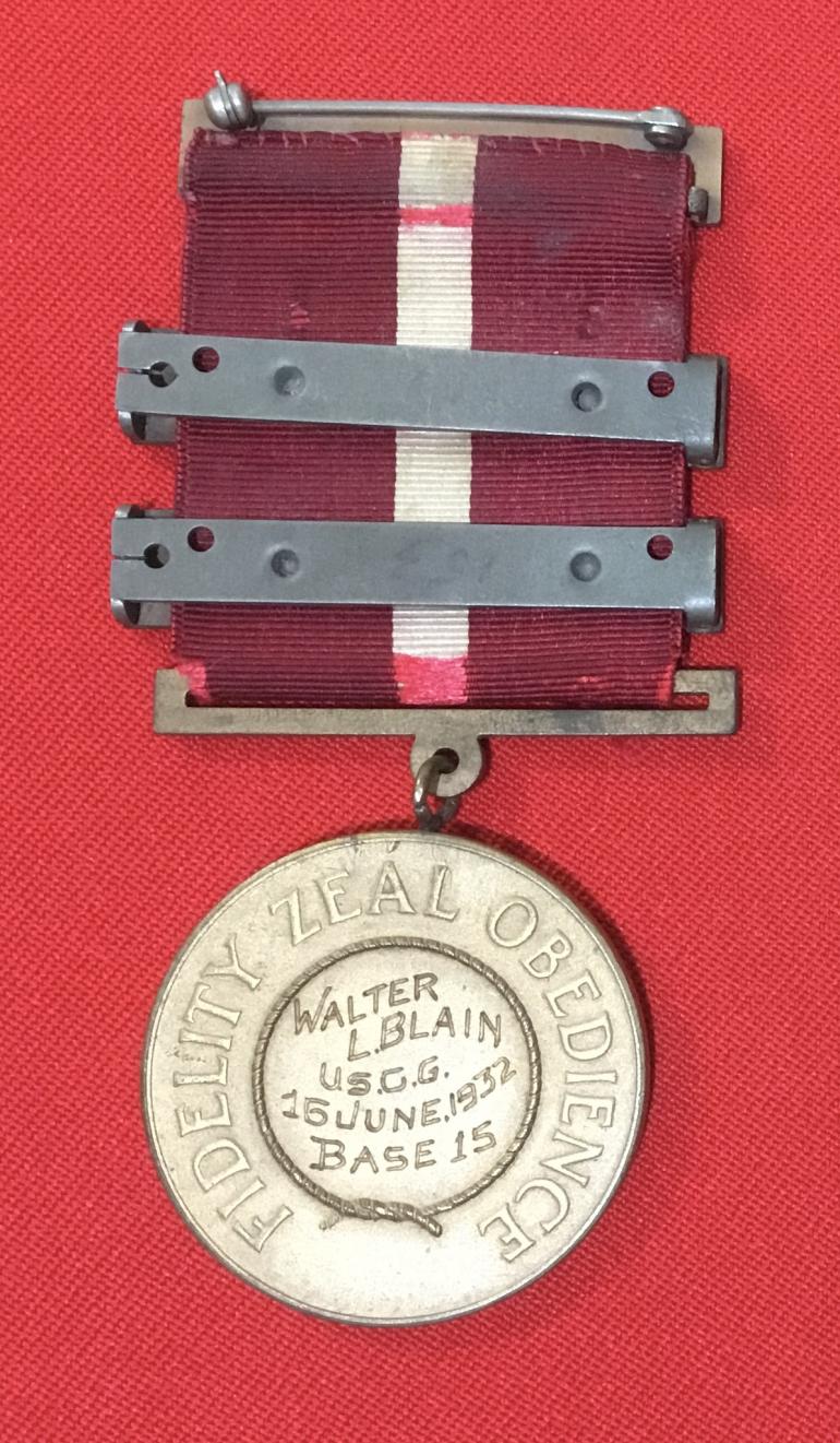 The Coast Guard is one service that I have always found it difficult to find period medals and information. This Coast Guard Good Conduct Medal is engraved on the reverse Walter L. Blain, USCG, 16 June 1932, base 15. The ribbon has two bars attached the top Bar is for the ship Legere with the reverse of the Bar engraved 15, June 1935. The lower Bar list the ship Kimball and the reverse of the Bar is engraved 15, June 1938. The ribbon that the hanger goes thru is starting to fray.