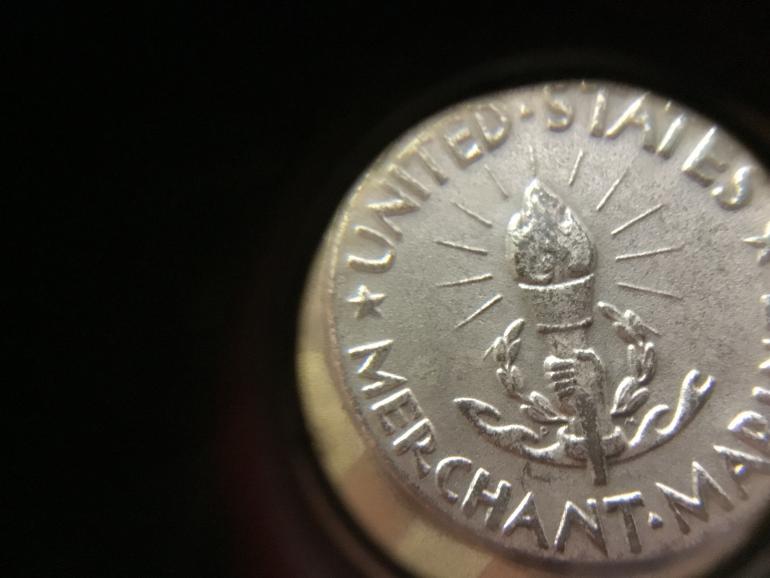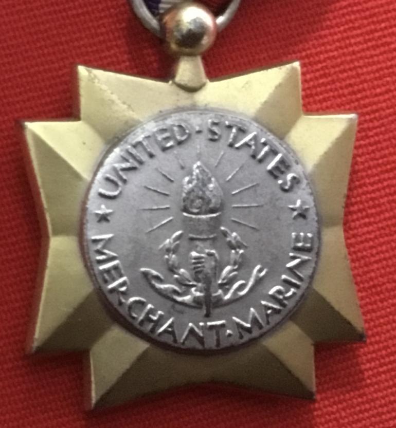 This Merchant Marine Mariner’s Medal is with its distinctive display case and full wrap broach. The reverse of the medal has the initials on both sides of the lower portion of the torch and has the triangle not a dot separating the words Merchant Marines. The Mariners Medal takes the place of a Purple Heart that can not be awarded to the MM as it is not considered a branch of the US. Armed Forces. It is awarded under the same criteria as the PH.