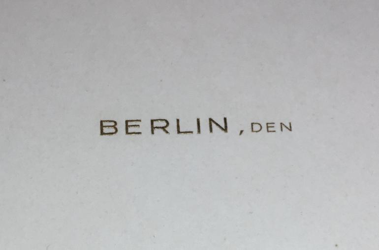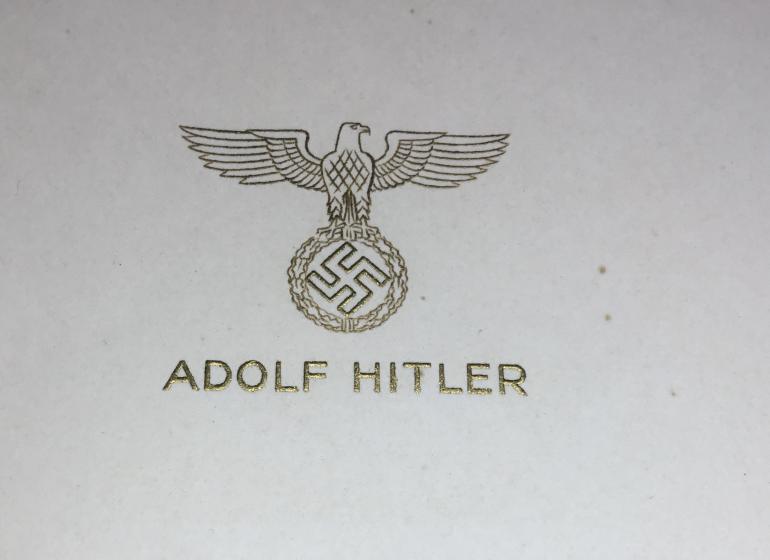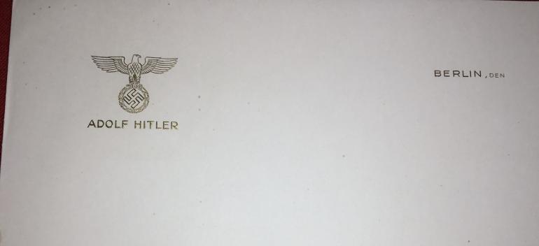 This double sheet of personal stationary for ADOLF HITLER has the National Eagle and A.H. In raised Gold lettering on the upper left side and on the upper right corner has the BERLIN, den, also in raised gold lettering. The stationary measures 8 1/8”wide by 11.5” high. This is the double sheet stationary that AH used in his personal correspondence. Again this came in a quantity of stationary, Christmas cards and blank cards.