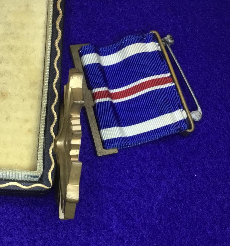 The DSC is the thicker Navy style and engraved with his name and three lines added above and one line under his name the ribbon bar is also the Navy style with the wider bar. The case is also the Navy style.