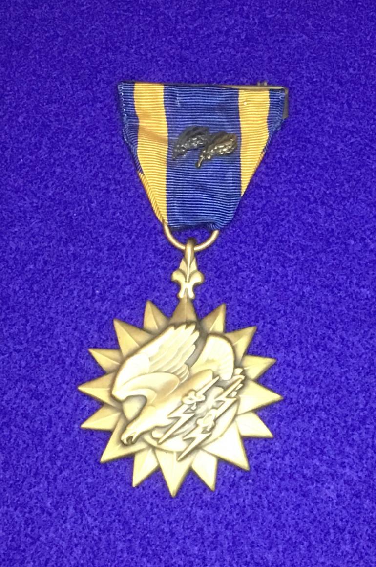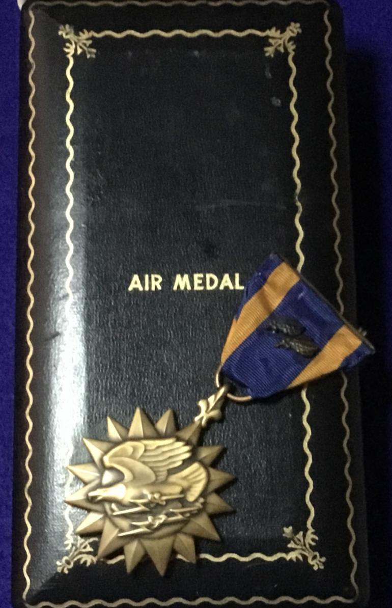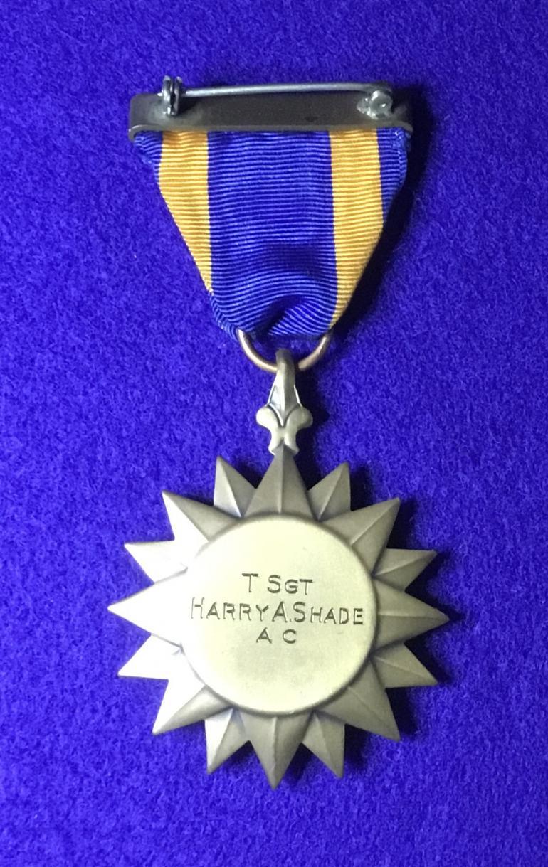 This Air Medal is named to TSgt. Harry A. Shade ASN-33315369 flying in a B-17 (42-25791 on a ferry mission that crashed December 29, 1943 near Rhys England. The flight was going to Southport in inclement weather which was listed as the reason for the crash. All crew members and passengers were killed instantly. There were 17 personal aboard the flight. The bomber belonged to the 8th Air Force 334th Bomber Squadron, 95th Bomber Group Heavy. TSgt. Shade was previously awarded this Air Medal with two Oak Leaf Clusters. The missing Air Crew Report list the various planes the individual passengers belonged to. TSgt. Shade is buried at Cambridge American Cemetery Plot E Row 1 Grave 87.
