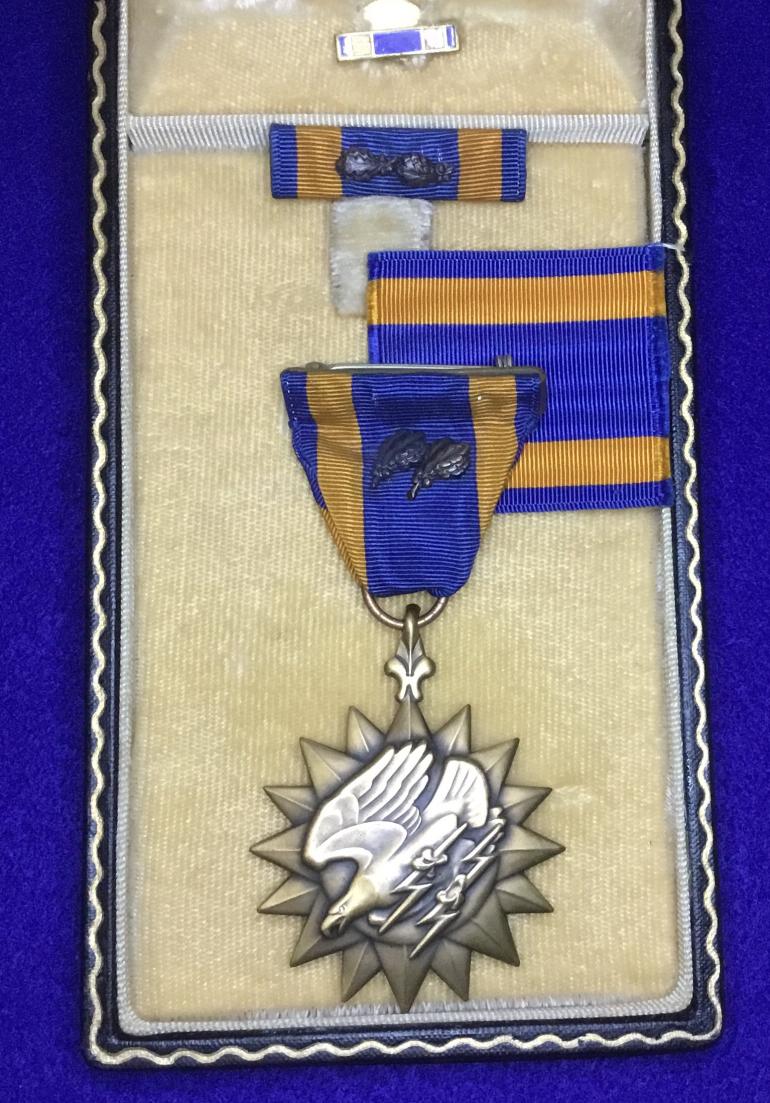 The Air Medal has a full wrap broach with two Oak Leaves and is engraved T Sgt Harry A. Shade A C included is the AM ribbon bar with two Oak Leaves, a strip of AM ribbon and a enamel button hole AM bar. The case is named and complete.