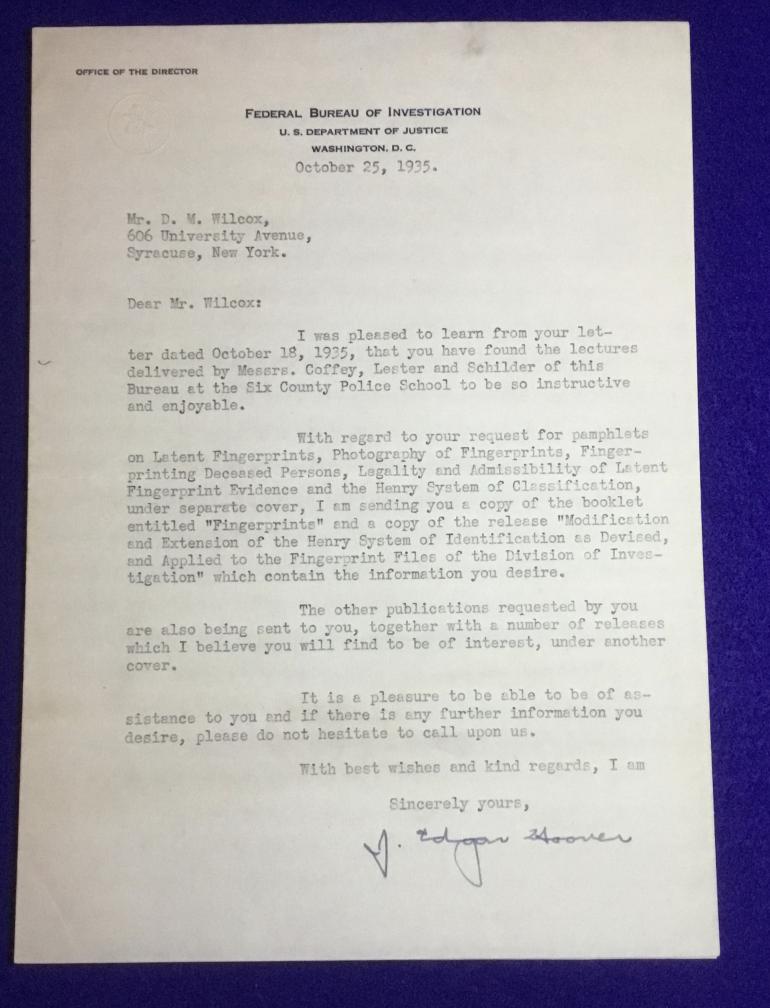 Something a little different for us. This is reply to Mr. D. W. Wilcox the SACO Lt. That served ic China. The request is for pamphlets on fingerprints foe deceased persons and the Henry System of Classification. The letter is on official FBI Office of the Director dated October 25, 1935. The paper is a folded sheet for multiple letter space. The original envelope is included.