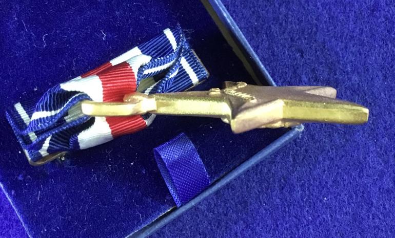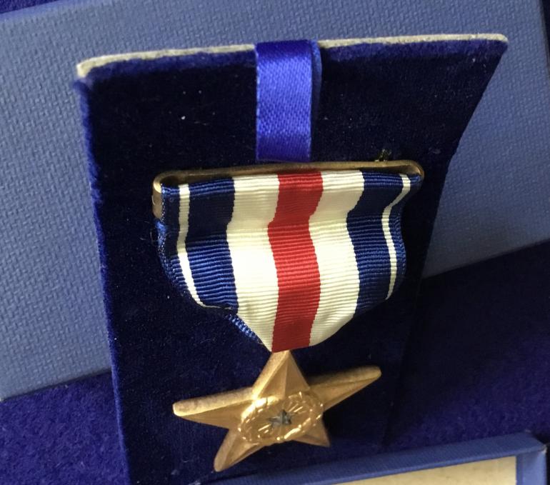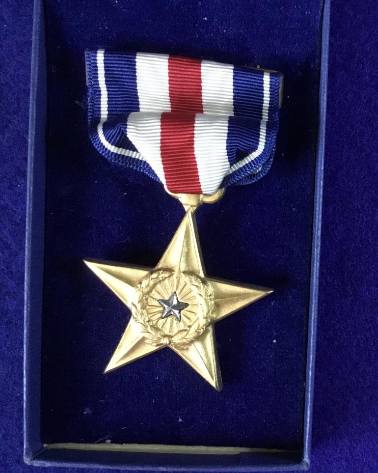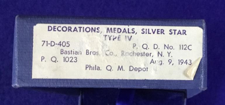 This Bastian Bros. Silver Star was produced in 1943 in the thick Navy style Star. The ribbon is attached with a full wrap brooch. The production box is labeled and has the date Aug. 9, 1945 along with the maker, order number and Depot.