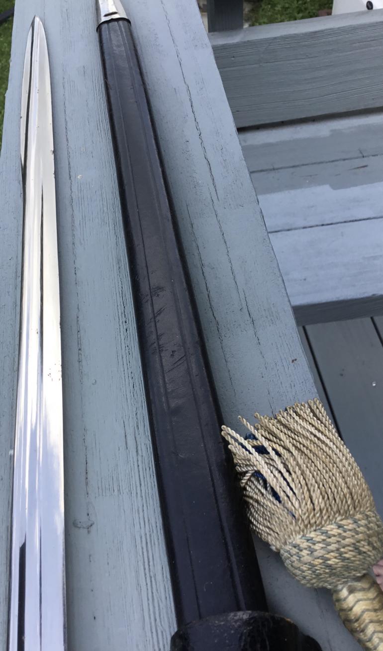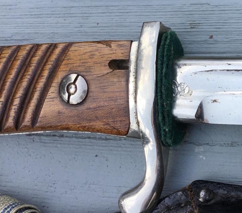 Without a doubt this is the finest 1898 Dress Bayonet that I have ever owned. I started to take the photos with the bright sun but in Syracuse the sun never last for a long time. This chrome plated bayonet is just such a looker the scabbard leather is straight and ridged with no nicks or finish lost. The fittings are held on with staples as they should be, there are no unit marking on the top scabbard fitting. The Bavarian Teoddel is in great shape with full color. The Pommel, backstrap and guard are of one casting and chrome plated. The wood grips are in great shape and they fit like a glove. The blade like every thing else is great shape except for a rust spot on the lower forward edge that has tamed a very small nip out of the edge. The upper false edge is not sharpened like the rest of the blade. There is a WKC knights head Logo near the green buffers by the cross guard.