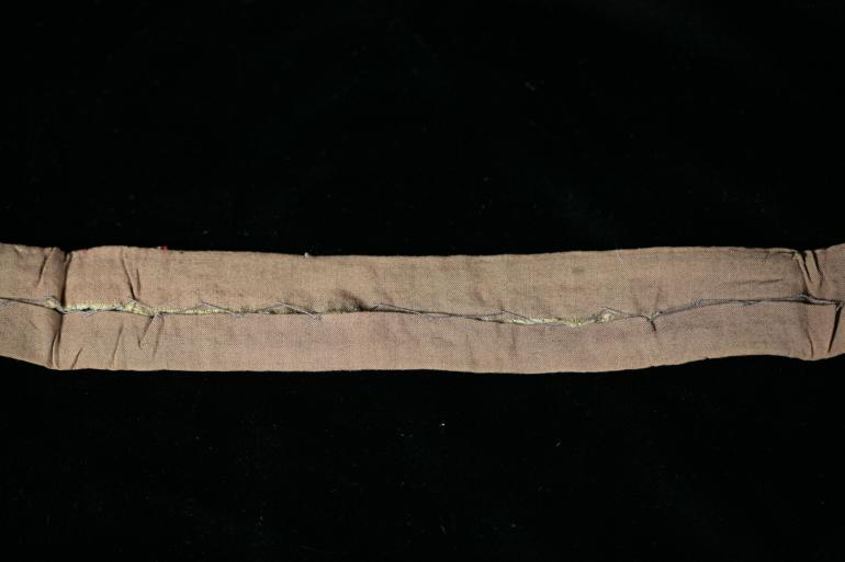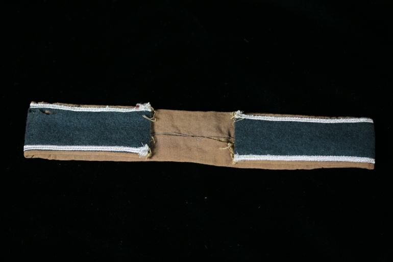 This is an exquisite cuff title that came out of a super high end collection several years ago. It has Wonderfull aluminum wire lettering as well as the upper and lower part of the band on a green field. It is also over a tan backing, its a really cool piece!