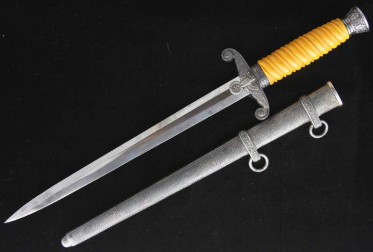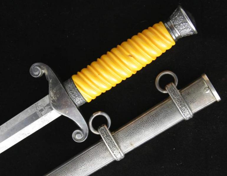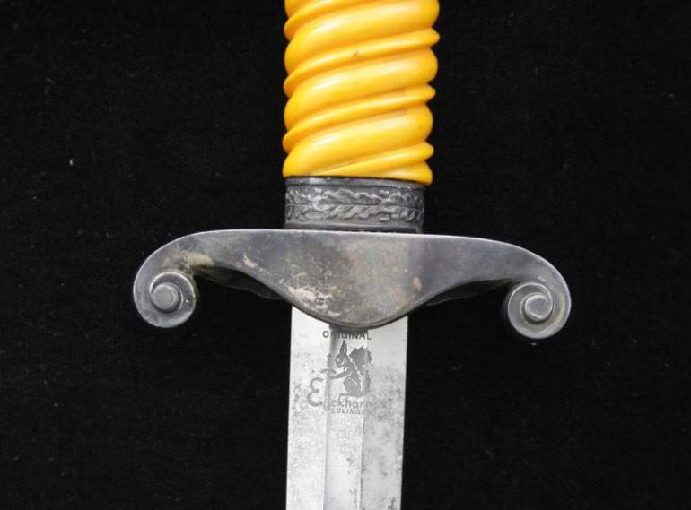 This is a wonderful dagger which I have contemplated keeping myself, the black patina is stunning!!! The grip is a very nice orangish color which contrasted against the black patina I love! The grip is in great condition, not perfect and mint but extremely nice. The back of the grip has a small chip but no big deal. The rest of the exterior fittings are really nice and better then most you will see. The blade does have some graying to it but not bad, this is a very collectable dagger is great condition with real character! The pictures do not do justice to the patina, this dagger is so much more stunning in your hand!