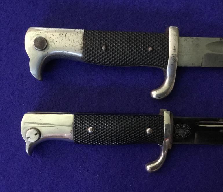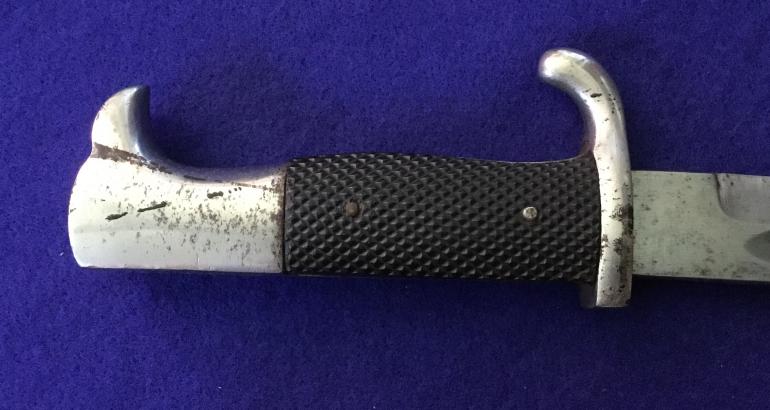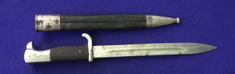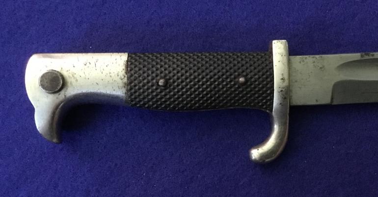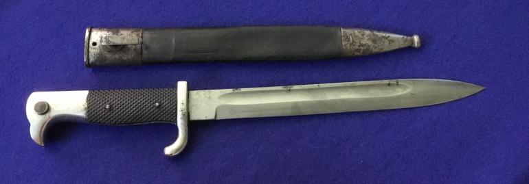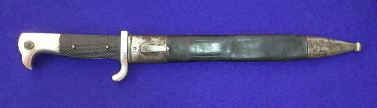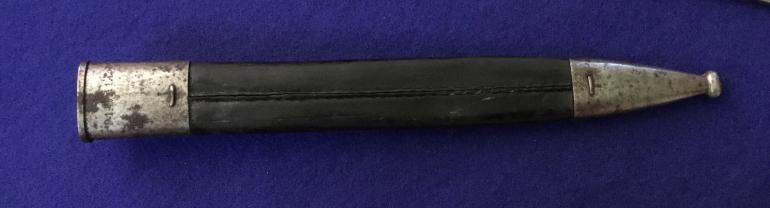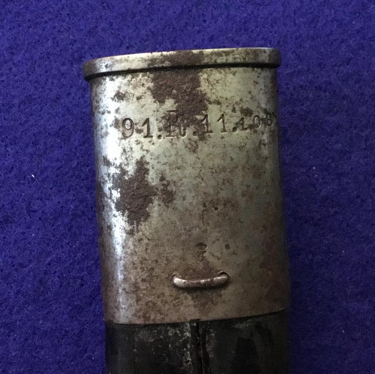 This massive Dress Bayonet is a first for me I have never seen one before. The overall shape and construction is what the later dress bayonets have followed except for the overall size os all the parts. This bayonet not only larger in all aspect it’s two or the-red times heavier. As always I will start with the handle/grip portion. The Bird head pommel is of course larger and the beak is much more pronounced, sharper beak. The pommel is slotted for mounting on a rifle but the button is not attached to anything with no possibility of mounting it. The grips are what we see on all later dress bayonets except held on with a much smaller size steel river. This Cross Guard is again typical of what we see but much heavier in construction. The blade also appears thicker with a center blood grove. There are no maker marks on the blade. The chrome playing has lost its brightness both on y=the knif and scabbard. The scabbard fittings appear to be plain polished steel with the leather held on with staples. The reverse OG the top fitting has the following stamped into it 91.FC.(?) 11. 108 not sure of the lettering as there is rust on that space that will have to be removed to properly read it. An unusual bayonet and I would not want to wear it all day.