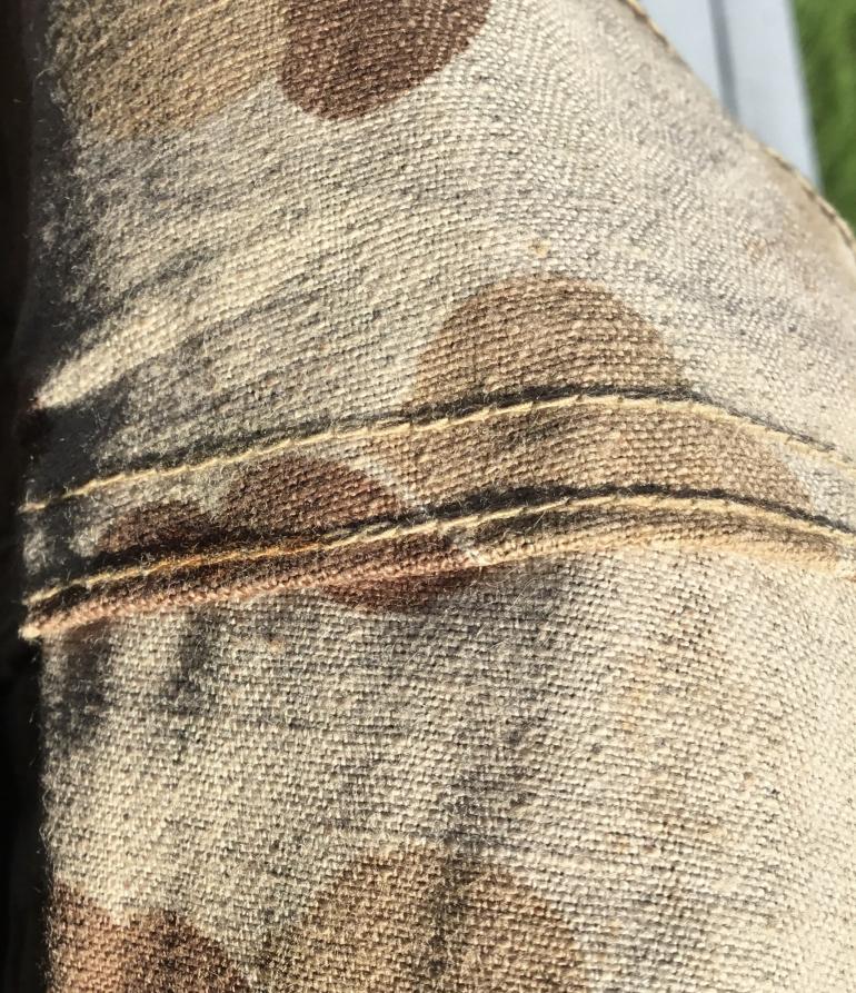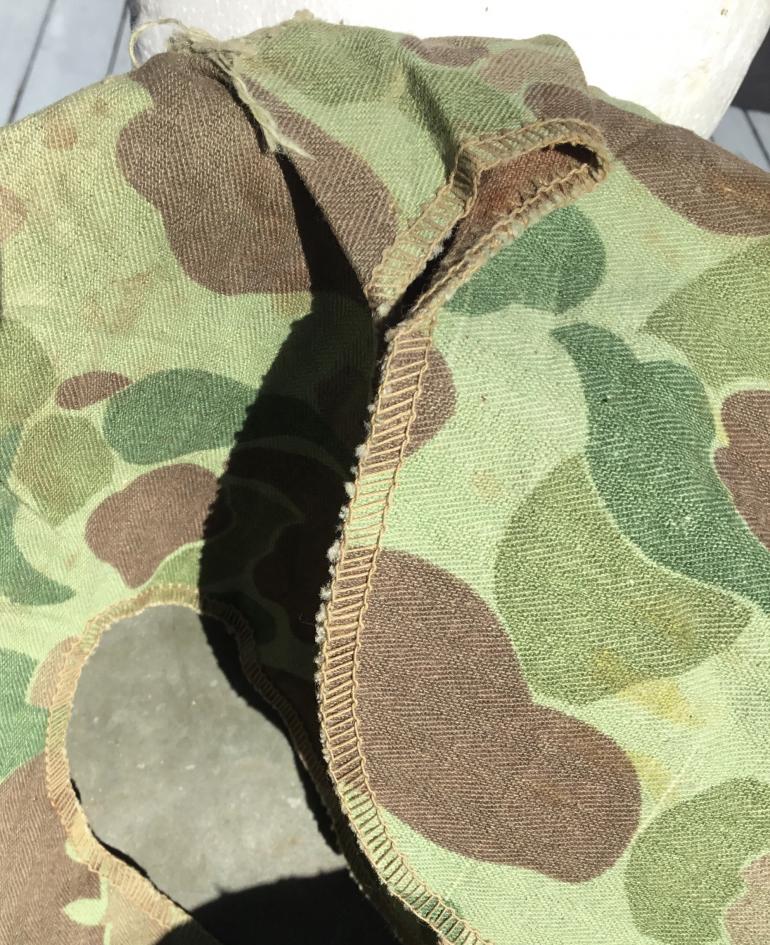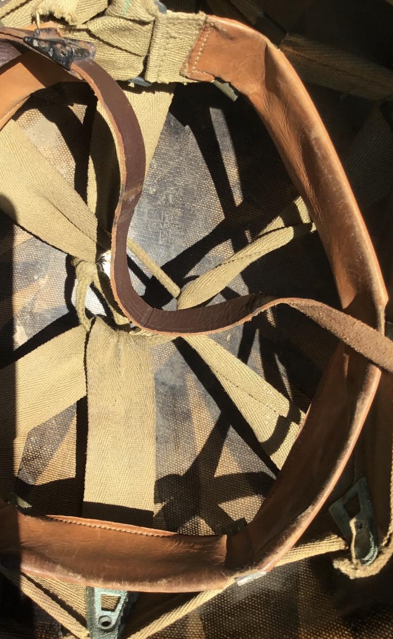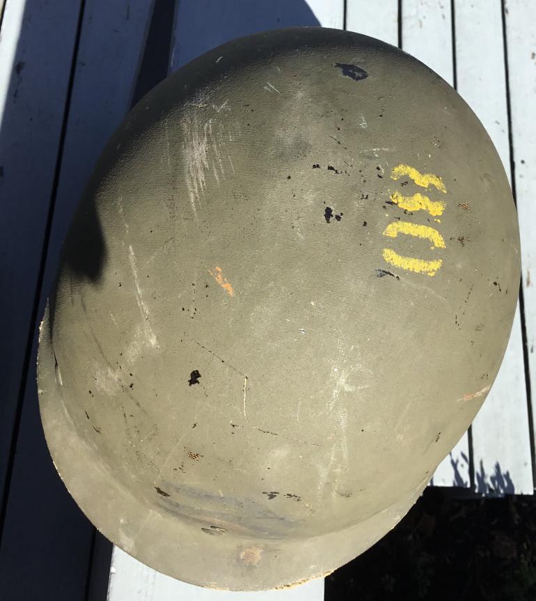 Just picked up this swivel bail front seam USMC M1 helmet with a camo cover. I will start with the herringbone cover that has the the black EGA on the front. The cover itself shows lots of wear, but still has most of the exterior camo color. It appears that the cover was worn the EGA down towards the front rim and also higher up as the cover has two separate wear lines on the front and back side for this to happen. The sides are cut open for the straps and the top of the cover has the most wear most likely used as a seat. The of the toungs that are between the shell and helmet are in full color as is the reverse side of on toung has a yellow 80 stenciled. The M1 swivel bail shell is marked 11102 and has the complete chin strap. The liner was made by Capac Mfg. Co. and has the number 80 stenciled in yellow 0n the top. The liner is complete with all the components webbing, headband, tie string,and the leatherChin Strap. Helmet, cover and liner are used but complete.