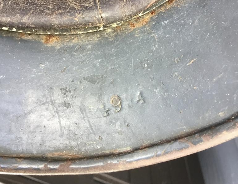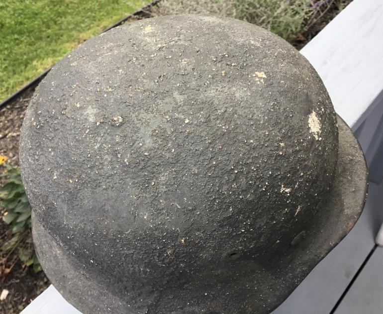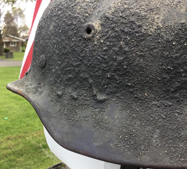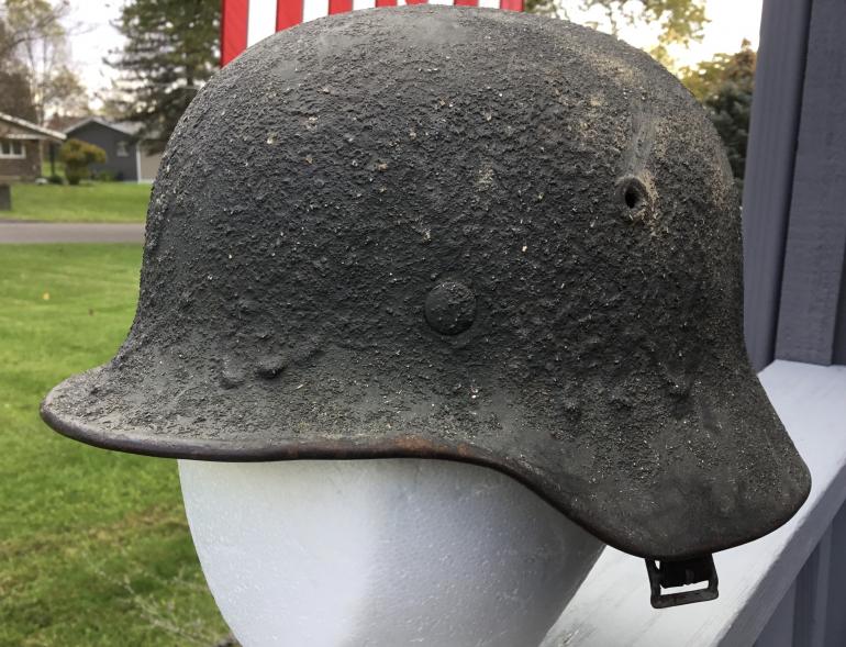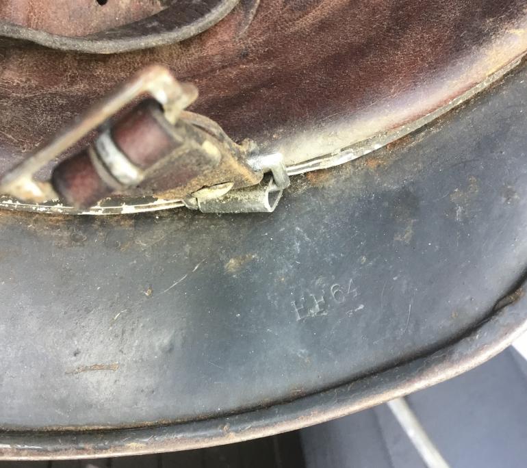This helmet is one of the last helmets out of my personal collection that I would never sell. It’s M40 no decal helmet with the heaviest, roughest camouflage covering I have ever seen. I really have no idea what was mixed with the paint to come the lumps along the skirt. The entire helmet is covered with a very rough material that ran down the side and caused the lumps in the paint as shown. The helmet is a EF64 batch no. 49?4 complete with a full leather liner and draw string. The leather is stiff but complete. The chin strap is also complete but stiff with age, and maker stamped.