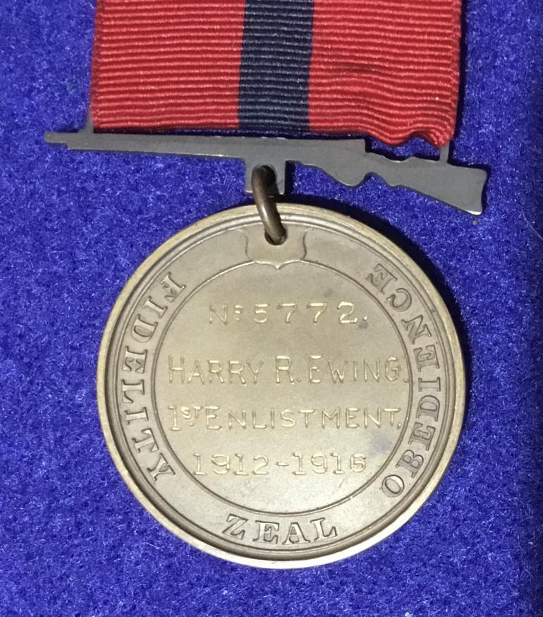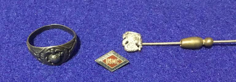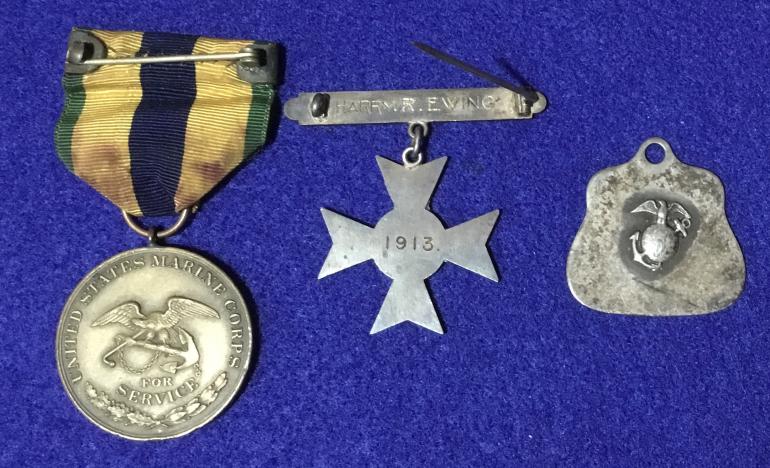 This is a great USMC group that my friend pulled out of a garage sale down south in a little town where he lives. This group is from Harry R. Ewing and includes A-USMC Good Conduct medal no. 5772 1st enlistment 1912-1916 B- USMC Mexico Campaign medal number 949 C- WWI Victory medal D- Sharpshooter Badge named on top bar E- EGA watch fob F- EGA Sterling Ring G- small USMC diamond shape enamel pin H- what appears to me to be a double head Eagle stick pin, Mexican? I- Sons of the American Revolution medal J- VFW medal K- K of C medal that is placed in the casket, this one is one of the better ones I have seen with an enameled shield and white cross arms.