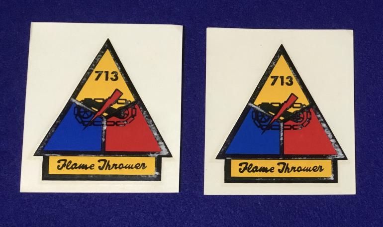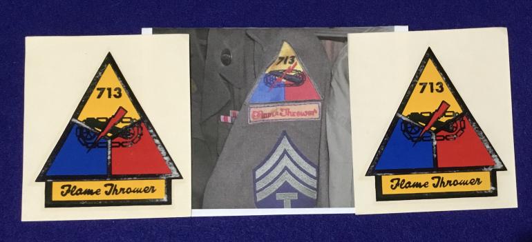 The full size 713 Flame Thrower Tank unit decals came with a uniform grouping that a friend picked up several years ago. The decals are 3.75” high by 3.5” wide. The second photo shows the actual uniform from the group with the patch applied.