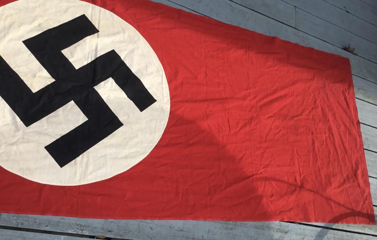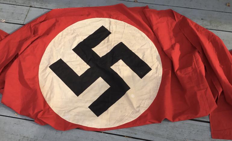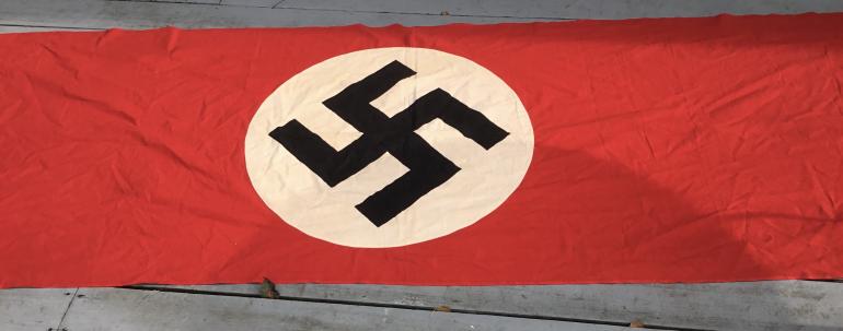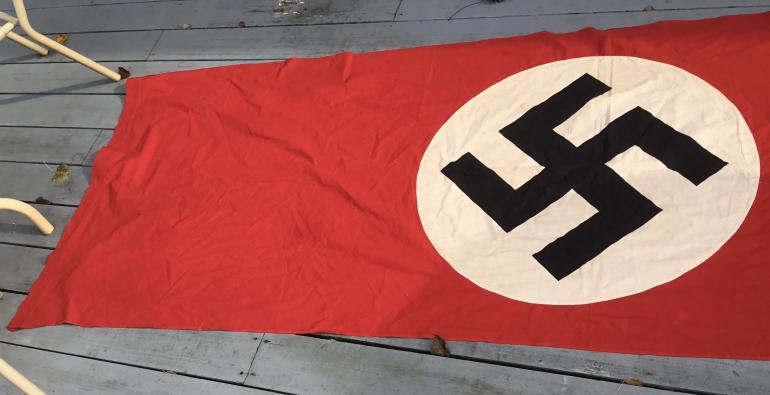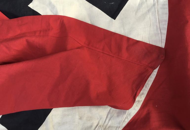 This NSDAP flag measures 9’ long x 3’ wide. It is made to fit on a pole note the close up of the last photo showing the sleeve construction. The flag has the white circle x the black silk screened swaz applied to both sides. The flag has vivid colors and just the right size for a display. NOTE the darker half circle shown on several photos is from a table on my deck blocking the sun. There are no dark spots on the flag.