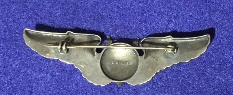 This is a great pin back Air Gunners Wing. The obverse has great detail an darkened with age. The reverse pin catch is missing the locking section. There is a raised Sterling mark. The wing has a nice raised center appears to have been done by the previous owner. No maker mark I would think a wing collector would know.