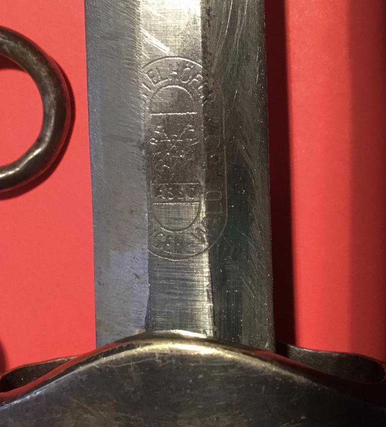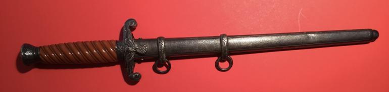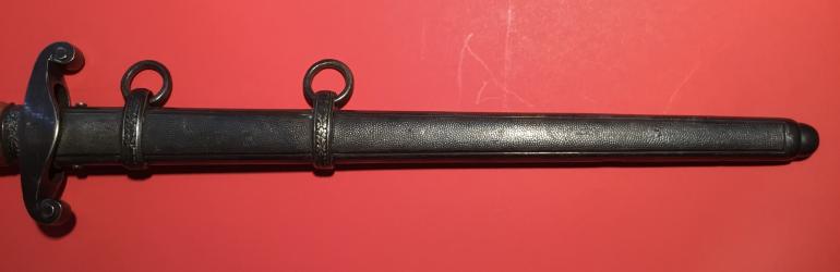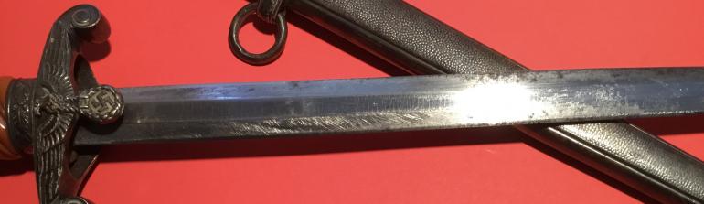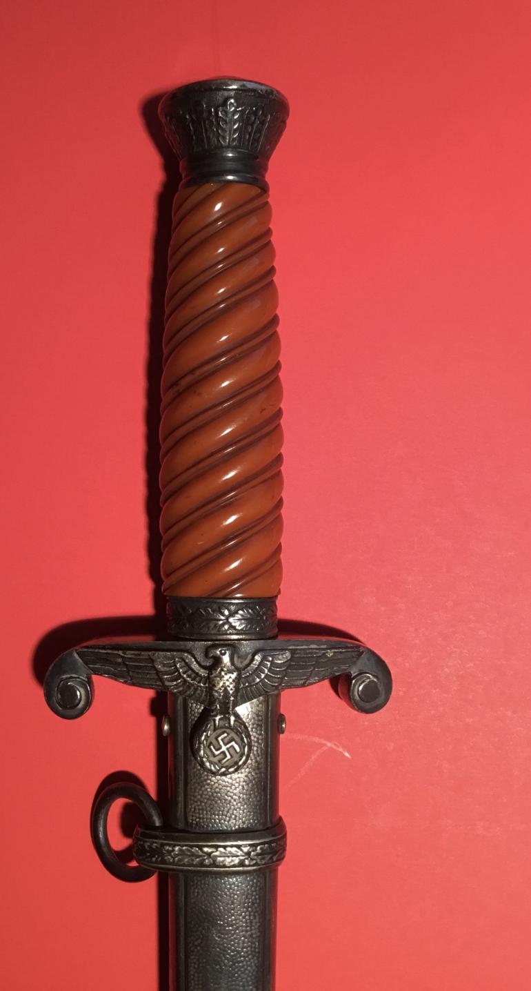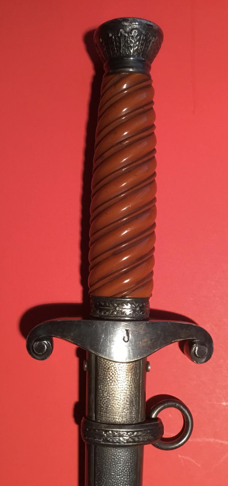 I recently purchased this Army dagger for my self and then I remembered that I don’t collect Naz stuff anymore. This Army Dagger really caught my eye I just love the early deeply slanted grip groves and the burnt orange finish that is same uniform color both sides. The aged nickel silver pommel, cross guard and scabbard are perfectly matched. The cross guard has the raised eagle chest and the letter J engraved on the reverse. The blade has been sharpened and hit with a grinder and maybe a file, the factory logo has been partially erased and what I can see I have to admit I don’t remember the makers name. The oval Logo has most of the makers name missing and it appears that there is a horse standing on his hind legs. I can make out the following portion of the name ELHOFER & co. I don’t have any of my files with me and I am past relying on my memory. The scabbard has a slight dent on the obverse side. A great looker display Dagger just a poor blade.