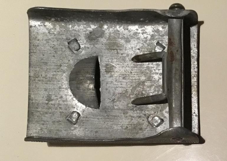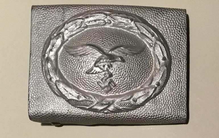 This mid war Luft dress buckle is made with the Luft oval applied with four prongs to the medal buckle. Nice economy method of making various buckles wit a smaller inventory. The paint is in good condition with obvious wear to the top and bottom sides where the hand was used to hook it to the belt hook. The buckle also has the punched out Heald dome to accept the belt hook. There is no maker name or RZM code. The buckle could be cleaned up.