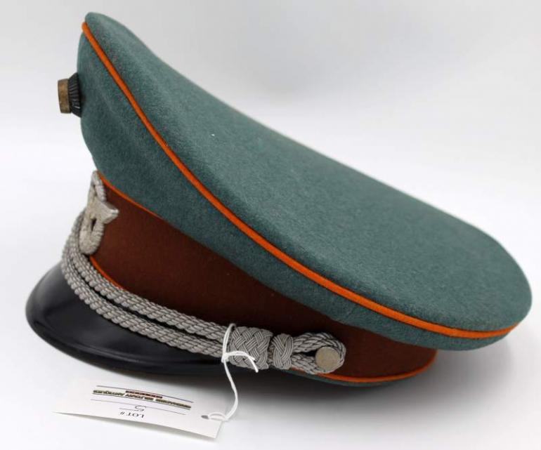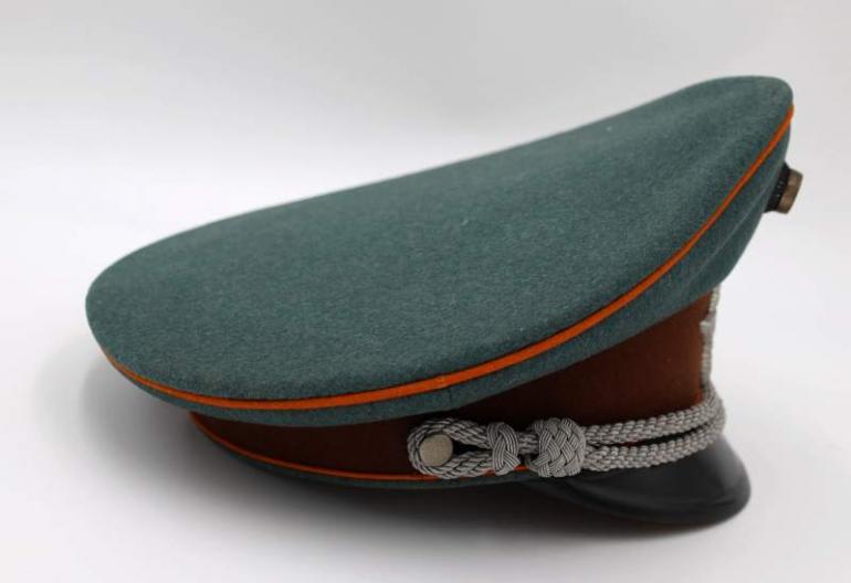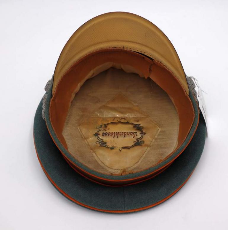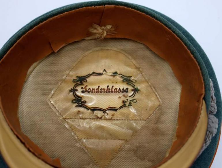 This is a wonderful conditioned and high quality visor hat, the body is in great condition, the top does have a few lines where bugs ate the nape but not much and not bad. It appears to be a larger size but I can not find a size stamp in it. The interior is a little dirty but still decent, the sweat band is torn. The sweat diamond also shows age but is there and marked "Sonderklasse". Overall it is a very nice visor but not perfect!