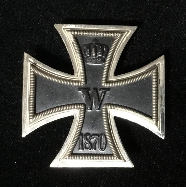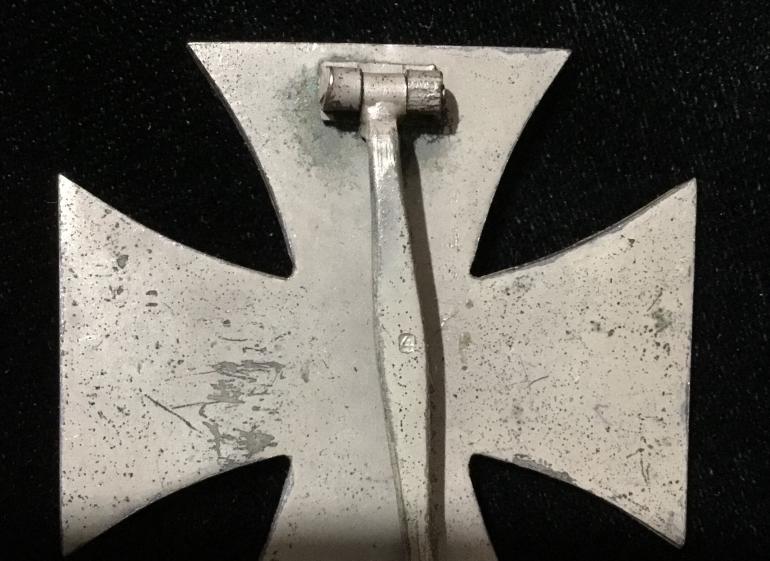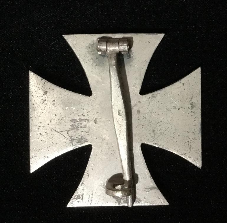 This 1870 EK First Class Medal was made by Steinhauer & Luck Ludenscheld during the third Reich period. The cross itself is typical WW2 construction standard three pieces, same hinge and catch, same coke bottle pin. the only difference is the WW1 insert that is non metallic. The pin is stamped in a box with the number four. There is still some of the original silver frosting on the obverse. I guess that there could have been some old timers left or possibly for display?