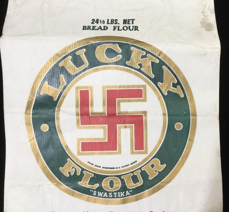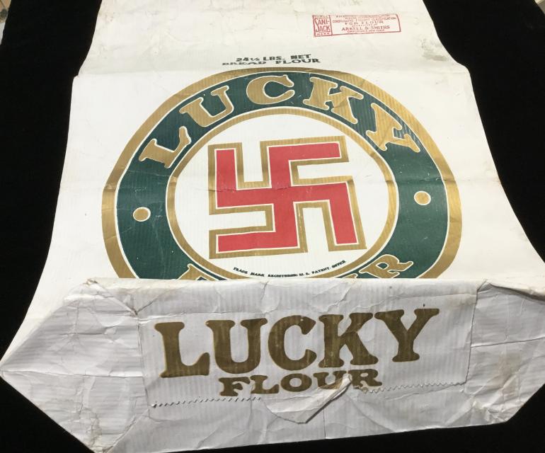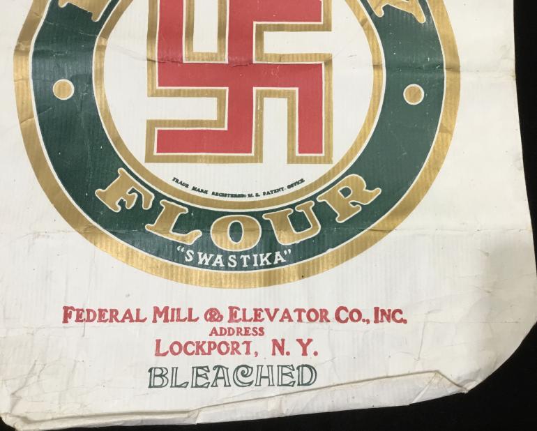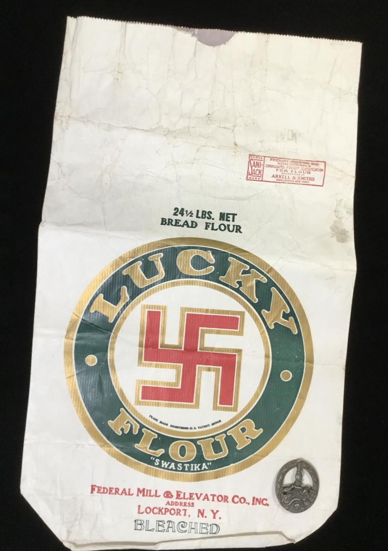 There I am walking along the sidewalk to the Antique shop in Sackets Harbor and laying on the side of the building are a bunch of old Flour Bags. Imagine my surprise to see this Swastika Lucky Flour bag along with some other bags. To be honest I did a double take like who would put a Nazi Swastika out in the open like that. It turns out that this particular Lucky Flour “Swastike” was the brand name used by the Federal Mill & Elevator Co. of Lockport N.Y. From 1900 to 1910.