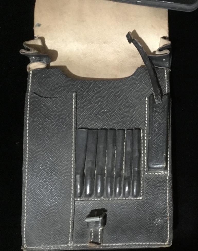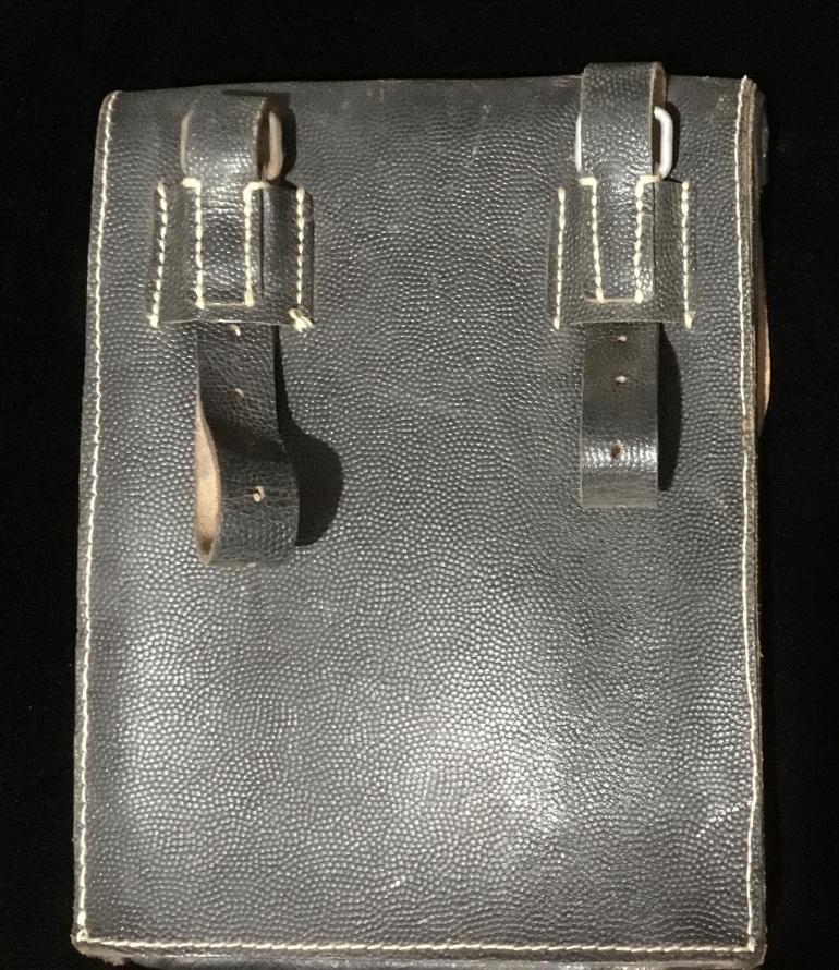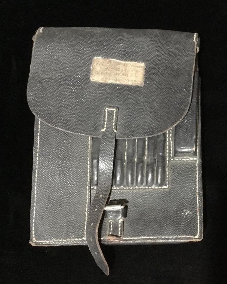 This is a real period map case not one of the many repros out there. This rarely used case shows very minor usage. It is complete with pull tab to remove the artillery instrument and the complete rear straps to fasten it to your belt. The front of the flap has what looks like a piece of white hospital tape with a GI’S name PFC Chas ? Then his serial no. 42095024 then Co B 495 Inf reg and dated. Note don’t trust my reading of the tag. Just the nicest that I have had in years, with a GI usage.