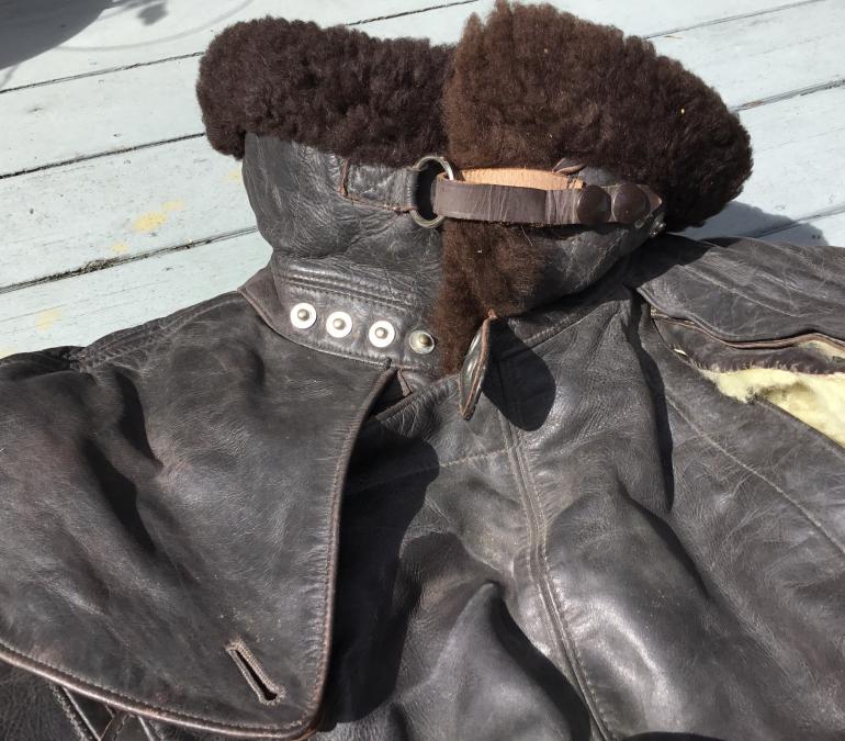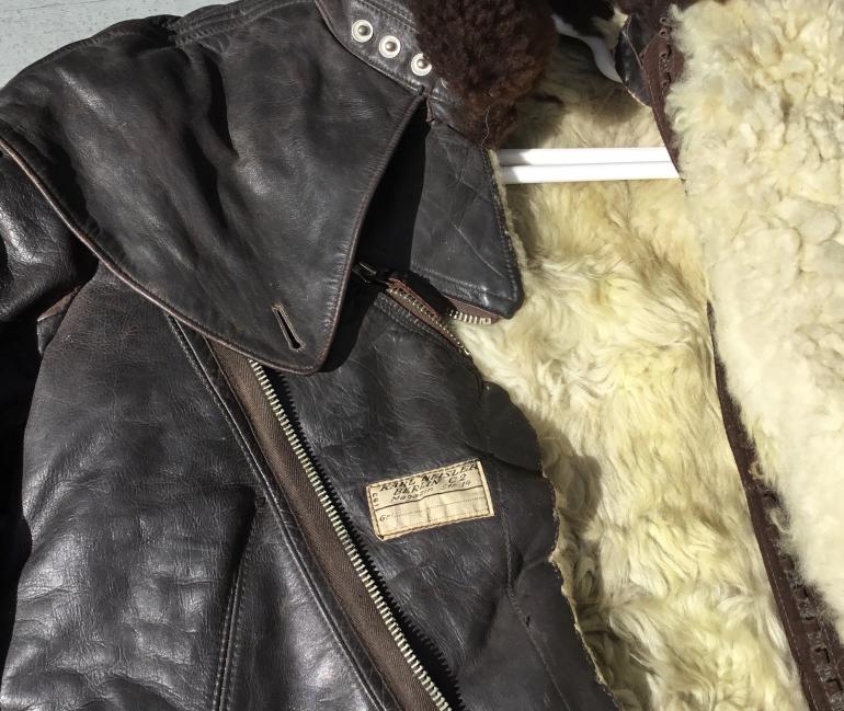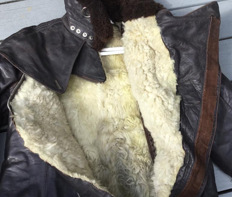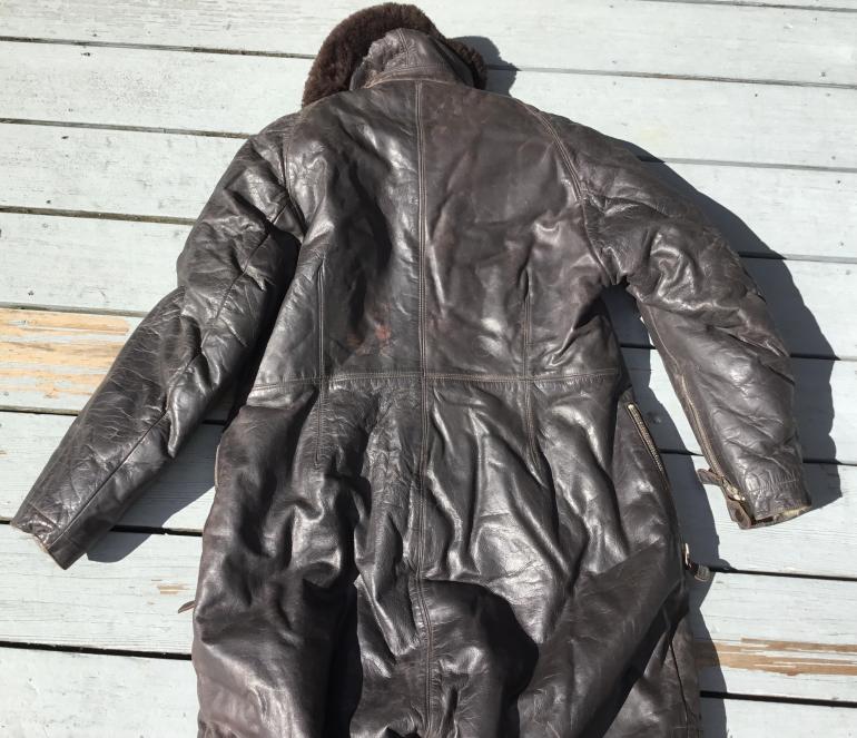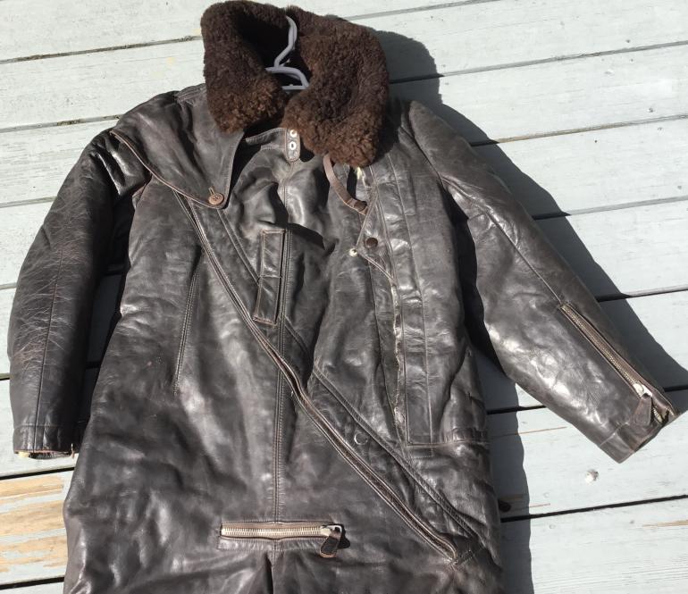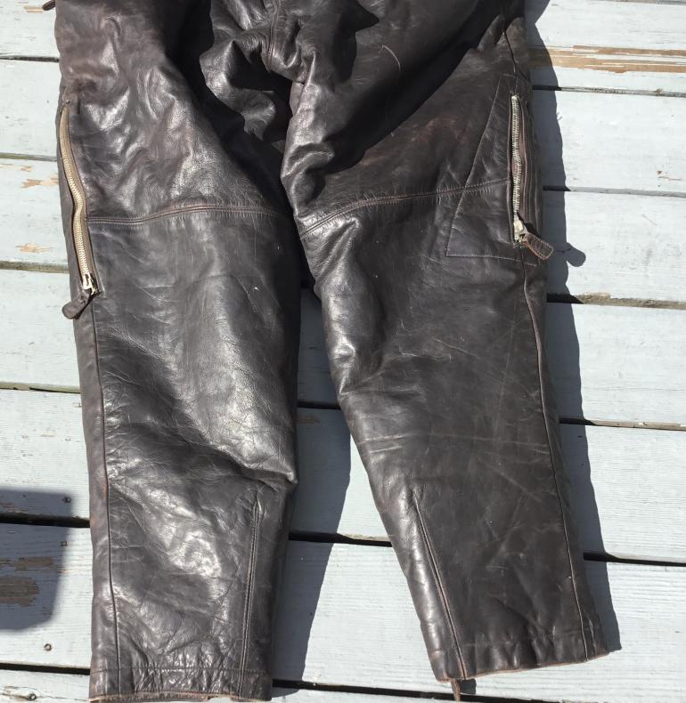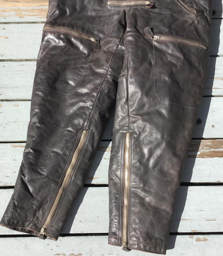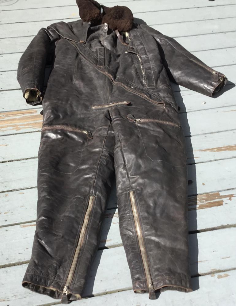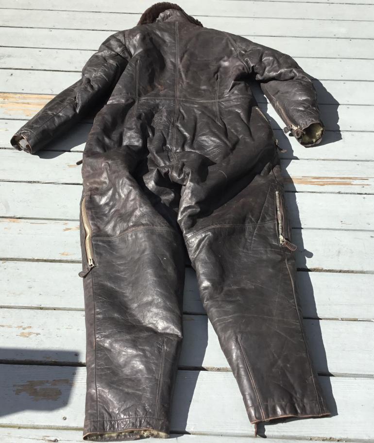 I do not know what the nomenclature is for this extreme weather high altitude leather one piece flying suit. I have seen similar cold weather uniforms but they differ with two zippers instead of one running from the throat to the crotch. I would presume that they are a later design as I don’t think this style would be noted for quick escape from it. The coverall has multiple zippers and all work except the right leg bottom zipper. The mfg tag in inside the right side inner wall. This thing weighs a ton shipping will be expensive. The last time I had a chance to buy a similar set the guy used it for ice fishing and ruined the bottom of each leg. He said it was the only thing that kept him warm and he didn’t need a wind breaker.