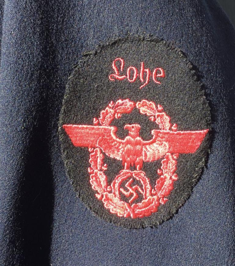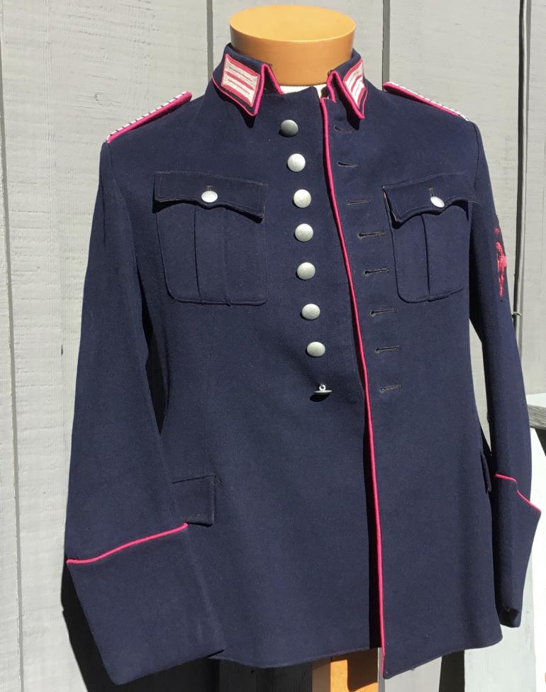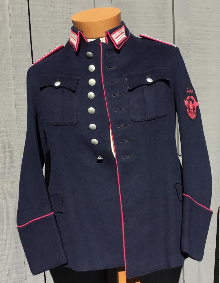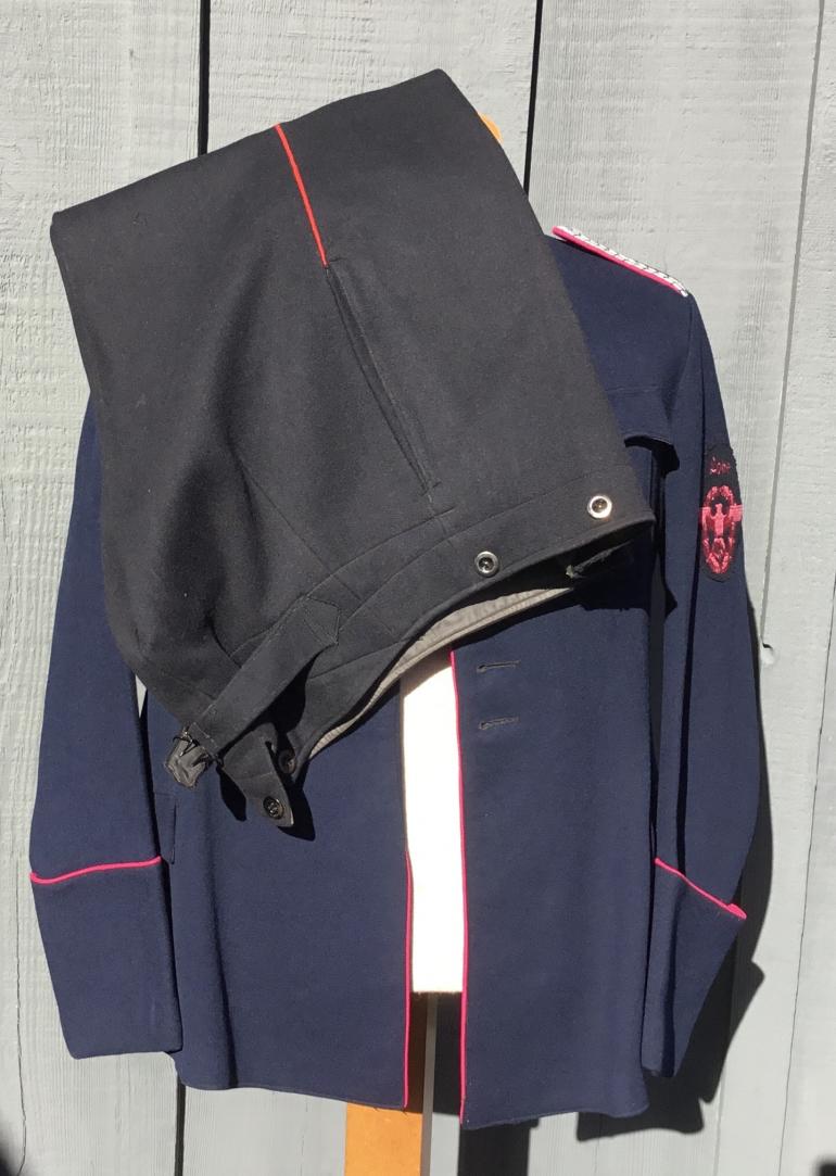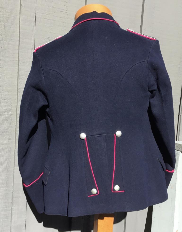 This is an early set of Fire Police Dress Tunic & Pants that are a recent pick up. The tunic is a tailored custom made set with no makers tag or size listing. This tunic was made with a high quality dark blue wool material. The interior is lined with no secret pockets. The collar Lintzes are flat wire bullion, the epaulets are correct and made with bullion wire and the pink eagle arm patch is the standard Police emblem withe the Letters LOHE above the eagle. The patch is hand sewed to the tunic. I would guess that the tunic size is a US 34. The tunic has all the aluminum buttons, the pink piping has minor moth damage only on the rear side of the collar.