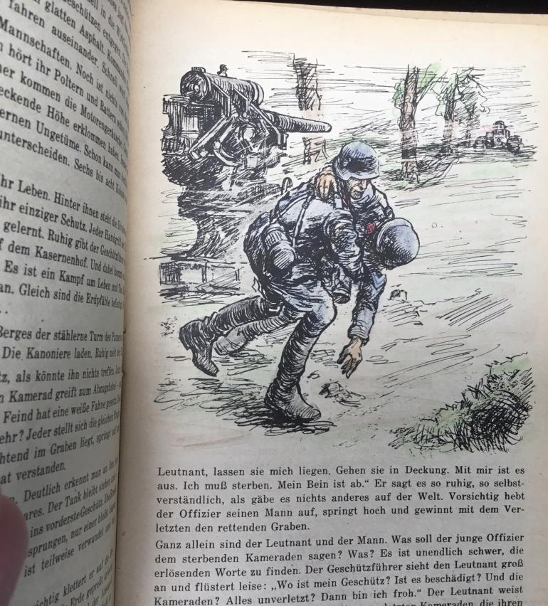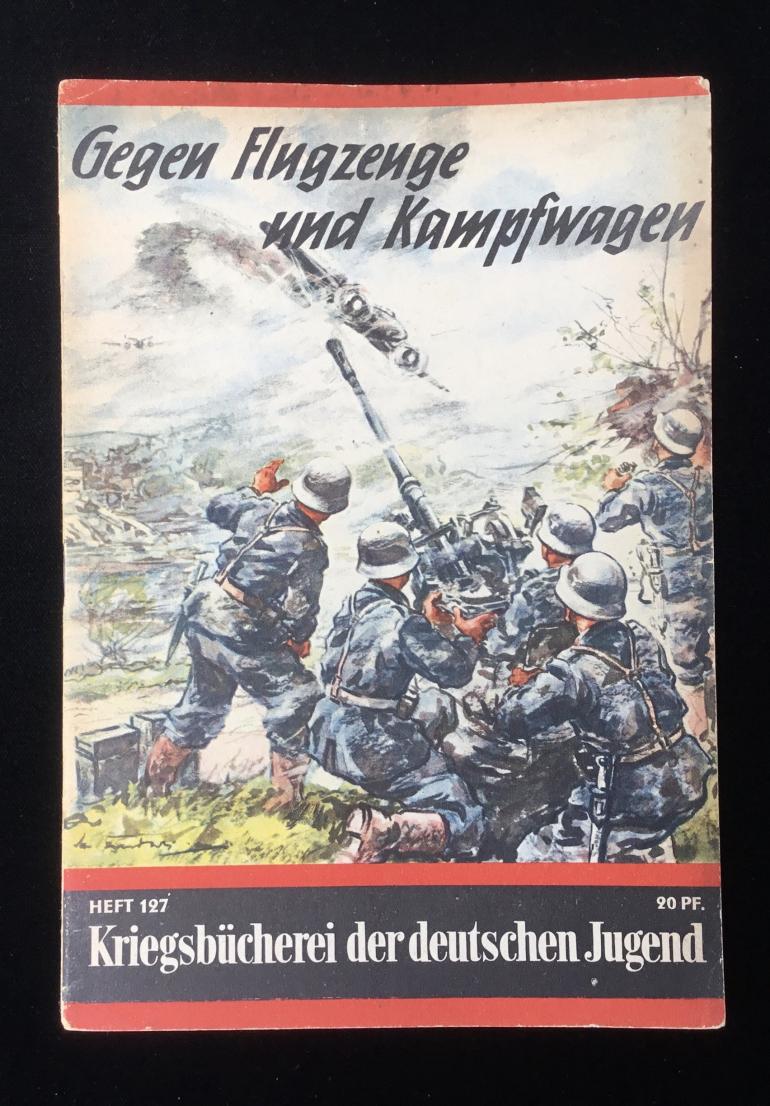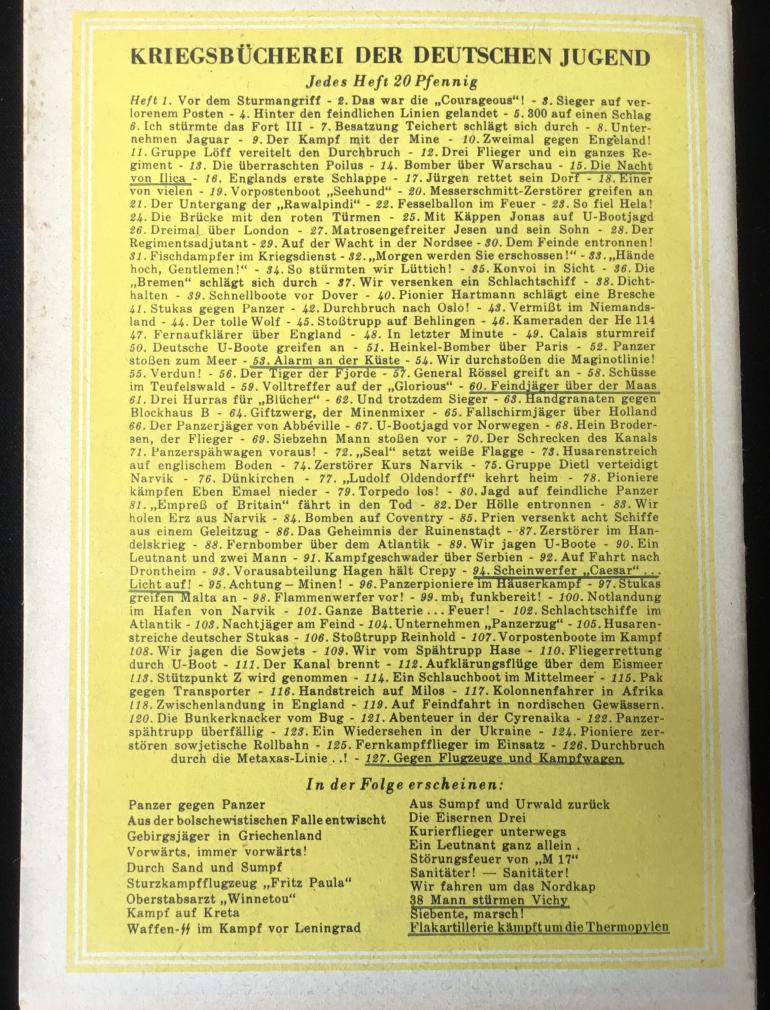 This propaganda book;et for the HJ is no. 127 out of 127 for sale to help mold young minds. This 5.75” W x 8.15 H is rather nicely presented with six hand drawing done in color showing both sides of war. The one drawing shows a soldier carrying a wounded comrade away from the 88 cannon. There are 16 double printed pages along with the cover. The back cover list all 127 booklets you can purchase this is a commercial product something you can spend your 20 pfennig on.