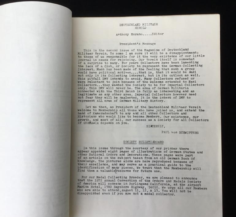This Deutschland Military Herold was a small German military collectors group and this Bulletin is the second issue dated April 1972. At that time there were 31 total members of the organization. I was collecting at the period of time and had never heard about this group nor in all the years up to about a month ago when this newsletter came with some other items. There are 15 pages including the covers. It appears to fill out the issue there are 7 pages that they copied showing medals from various countries. Just something different from an early collectors group.