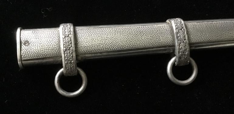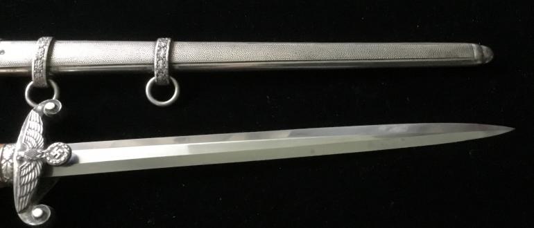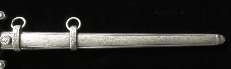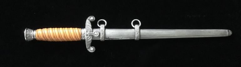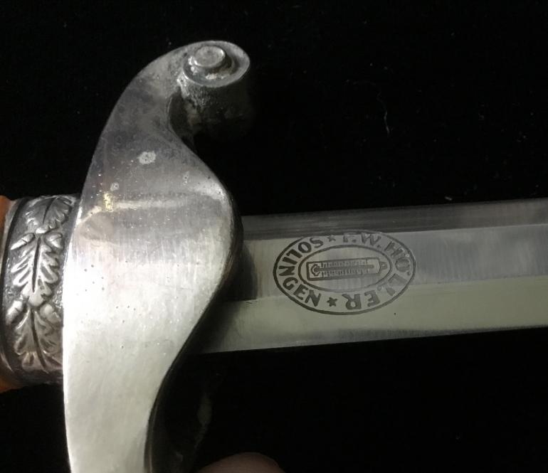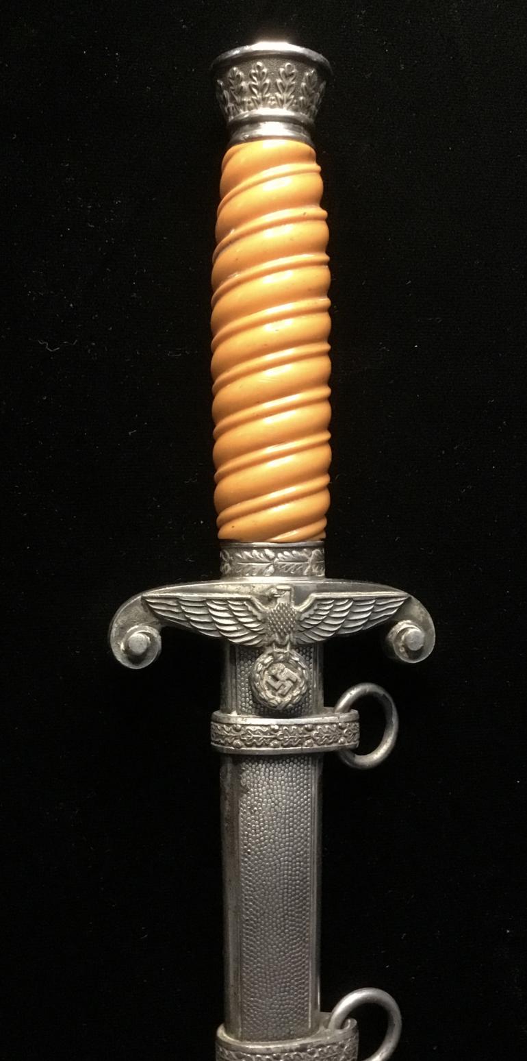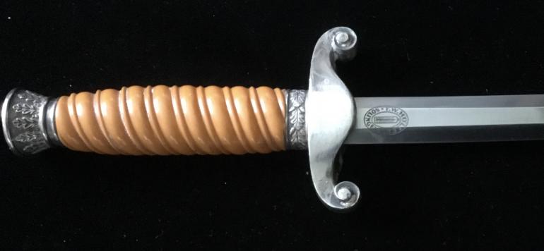 Just picked this one up at the Syracuse Gun Show a walk-in. This Army Dagger has great fittings, the Pommel, cross guard feral and scabbard all match on finish and quality. The grip has the dirty dark finish, meaning it has not been cleaned in A very long time. The groves have dirt, and sweat in they really accents the dark Orange handle. The blade is full length and has some gray spots that should be cleanable and they’re no nicks. The full Anton Wigen logo is present on the reverse side of the blade. The leather duffer is also present under the cross guard.