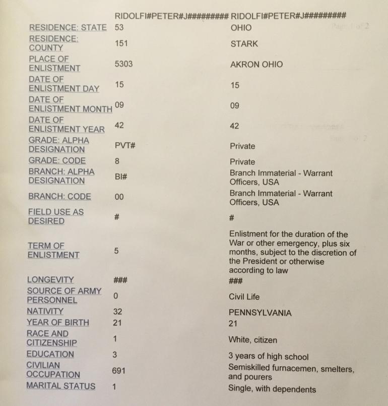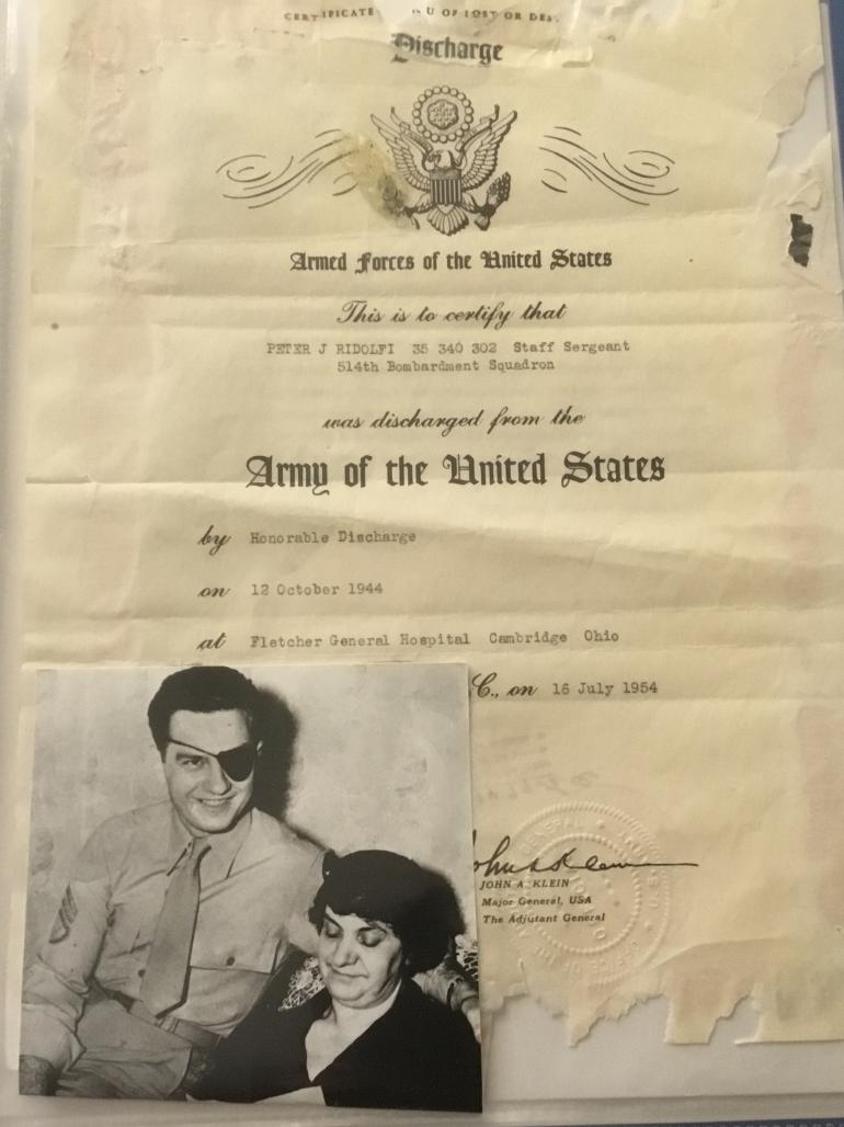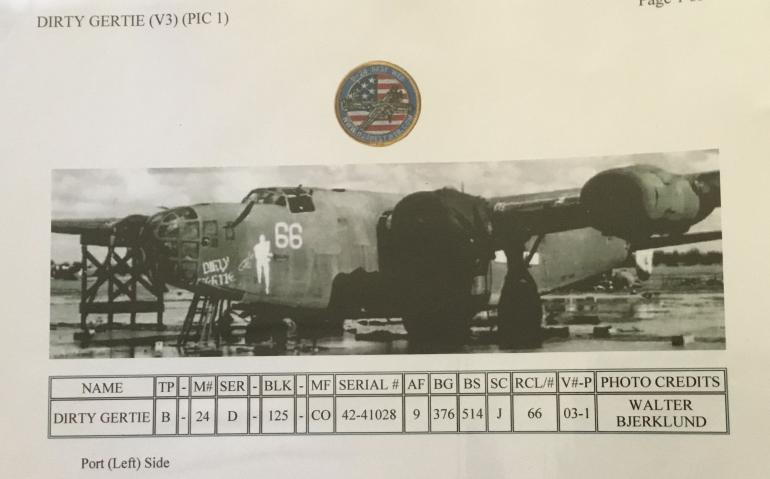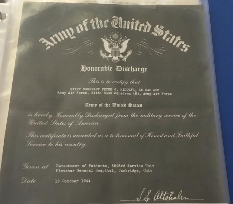 Staff Sgt. Peter J. Ridolfi ASN 35340302 was a top turret gunner on the B24D Bomber Dirty Gertie no. 66. The Dirty Gertie was in the 12th Air Force, 376 Bomb Group. 514 Bomb Squadron. She was shot down by German ME109’s and FW190 fighter planes near Athens Greece in October 3rd 1943. The Squadron was bombing an Air Field near Athens, also included is an Arial photograph taken that day.