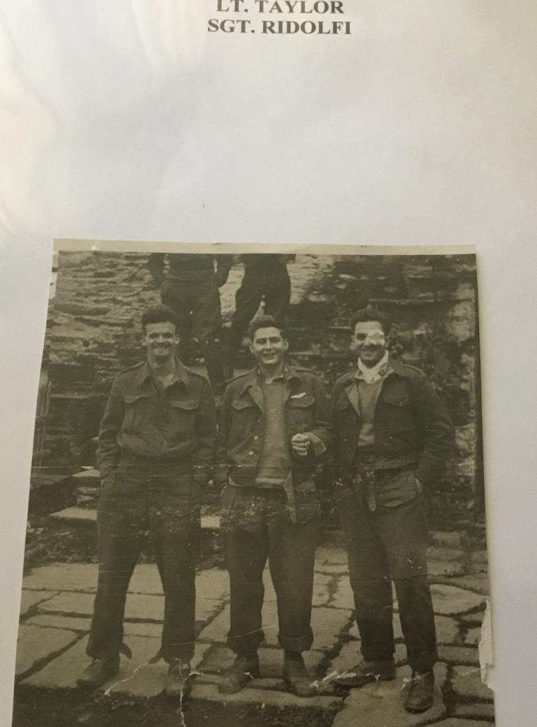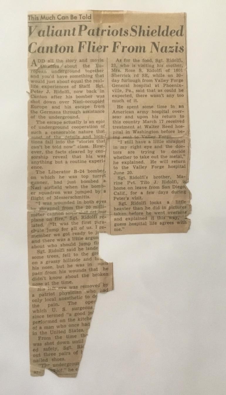 Sgt. Ridolfi was wounded in both eyes by 20MM cannon shrapnel that set the plane on fire. Everyone in the plane managed to parachuted safely out of the burning plane. Sgt. Ridolfi landed in some trees and wound up on a grassy hillside. From the time he jumped till when he landed he had also broken his nose. The pain from his eye wounds hid that fact. He was picked up by the underground and taken to a physician who removed his left eye. The physician only had local anesthetic to dull the pain. From the time he was shot down to safety he wore out three pairs of hob nailed shoes. There is a large gap between his being shot down and the underground passing him on to allied lines. This portion could not be told other that it took time and he wore out three set of hob nailed shoes. I have not found anything about the underground handling of Ridolfi on the internet. There are nine different photos of the Dirty Gertie but none of the crew. This will give someone and interesting story once all is fully researched. I really do not know how many Distinguished Service Crosses were awarded to flight crews particularly to a gunner.