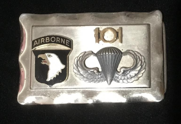 This Buckle looks great from the front with the sculptured 3 I/8” W x 2’ H Chrome plated background. The 101 is a plated gold finish, the Parachute is a modern insignia and the enamel Eagle and Airborne Rocker are one piece. All of this makes for a great display item. What I do not like is the reverse. All the applied emblems are fastened to the buckle with glue. Also it has the curved hook to adjust on the belt. But again a great display item.