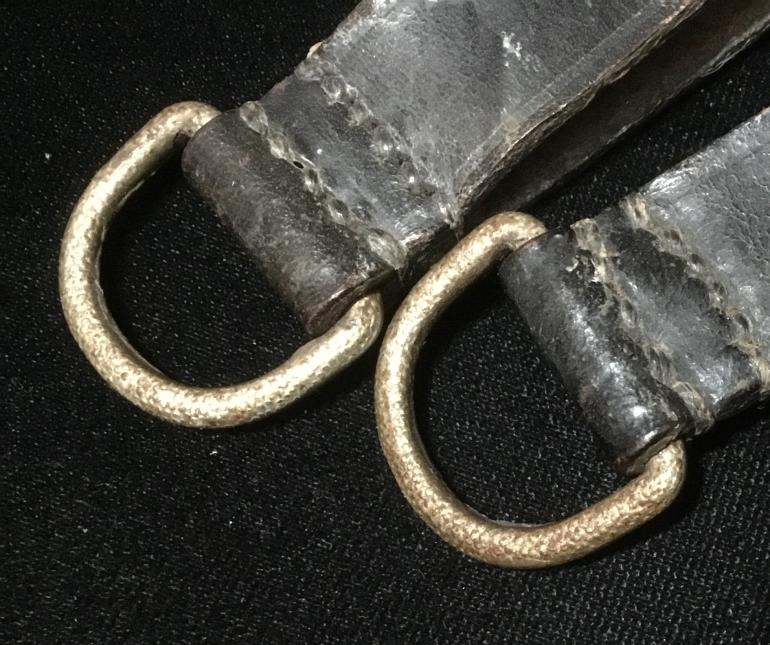 I have two dark Leather Leather Belt Loops with pebbled D rings for dagger hangers. Sold as pair Condition very good ++