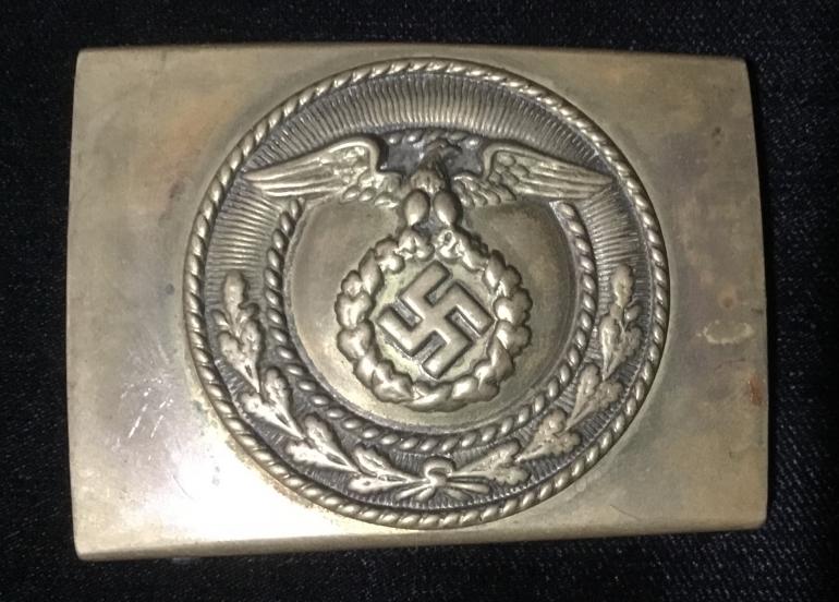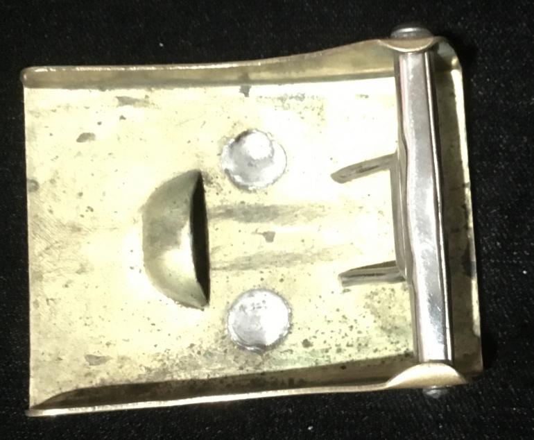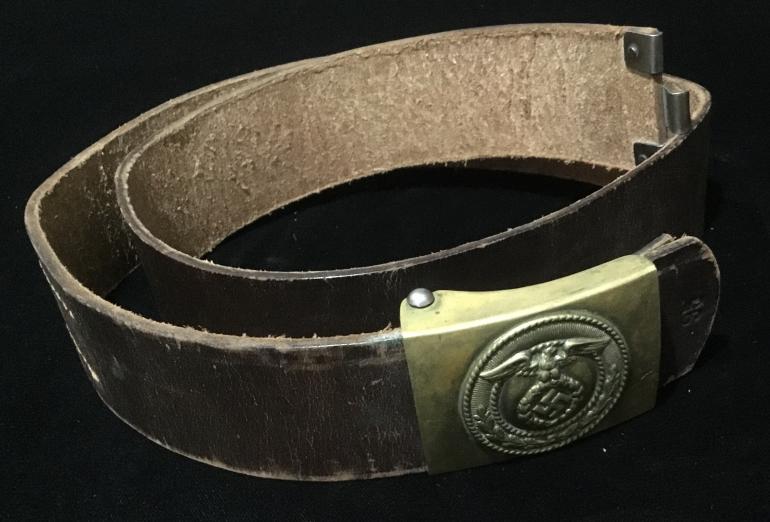 no makers name on the Buckle. The Swaz is made in the tilted style. The leather belt has a steel riveted brown leather and is stamped 95 on the obverse for the size.