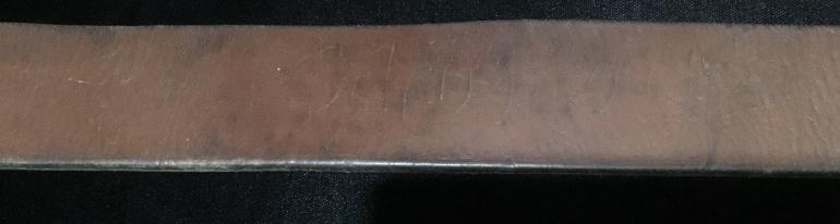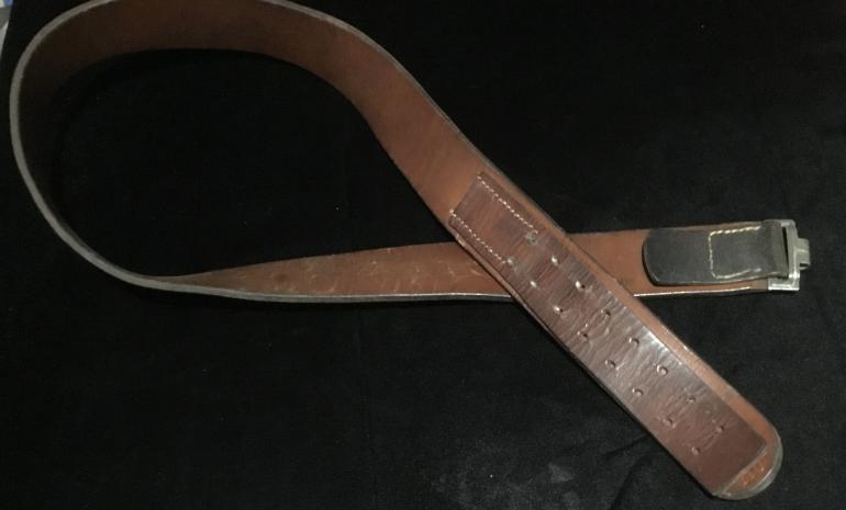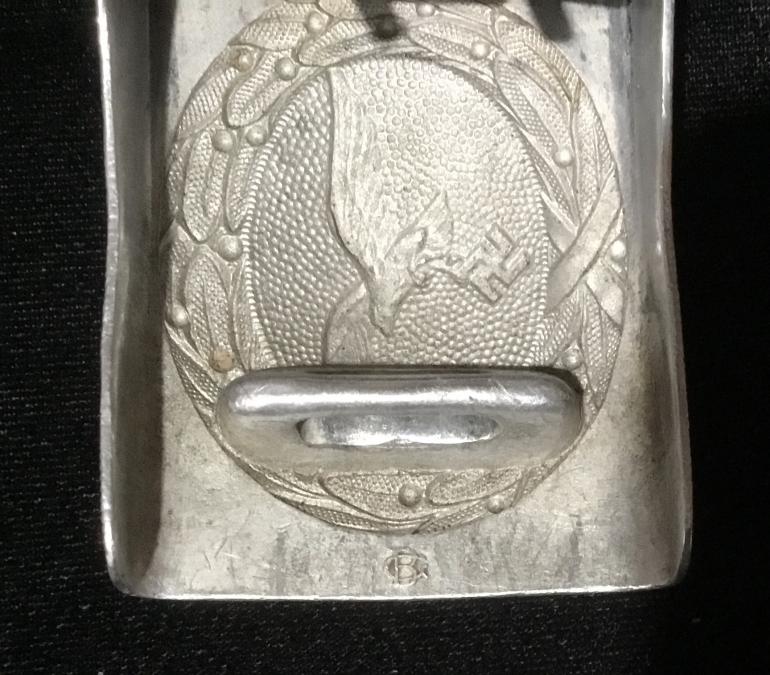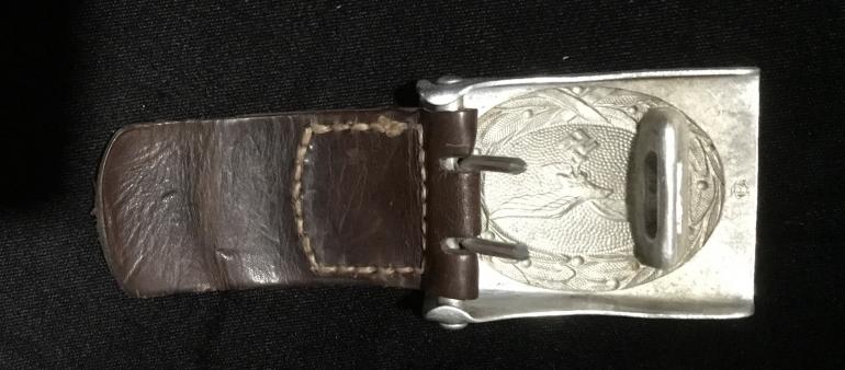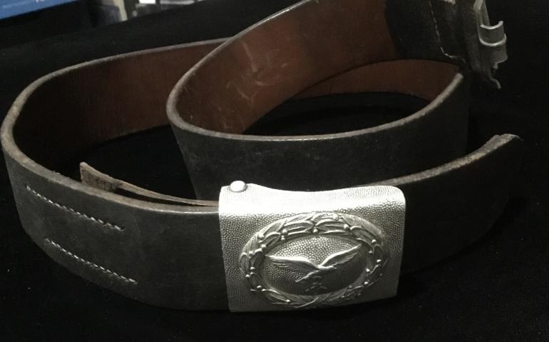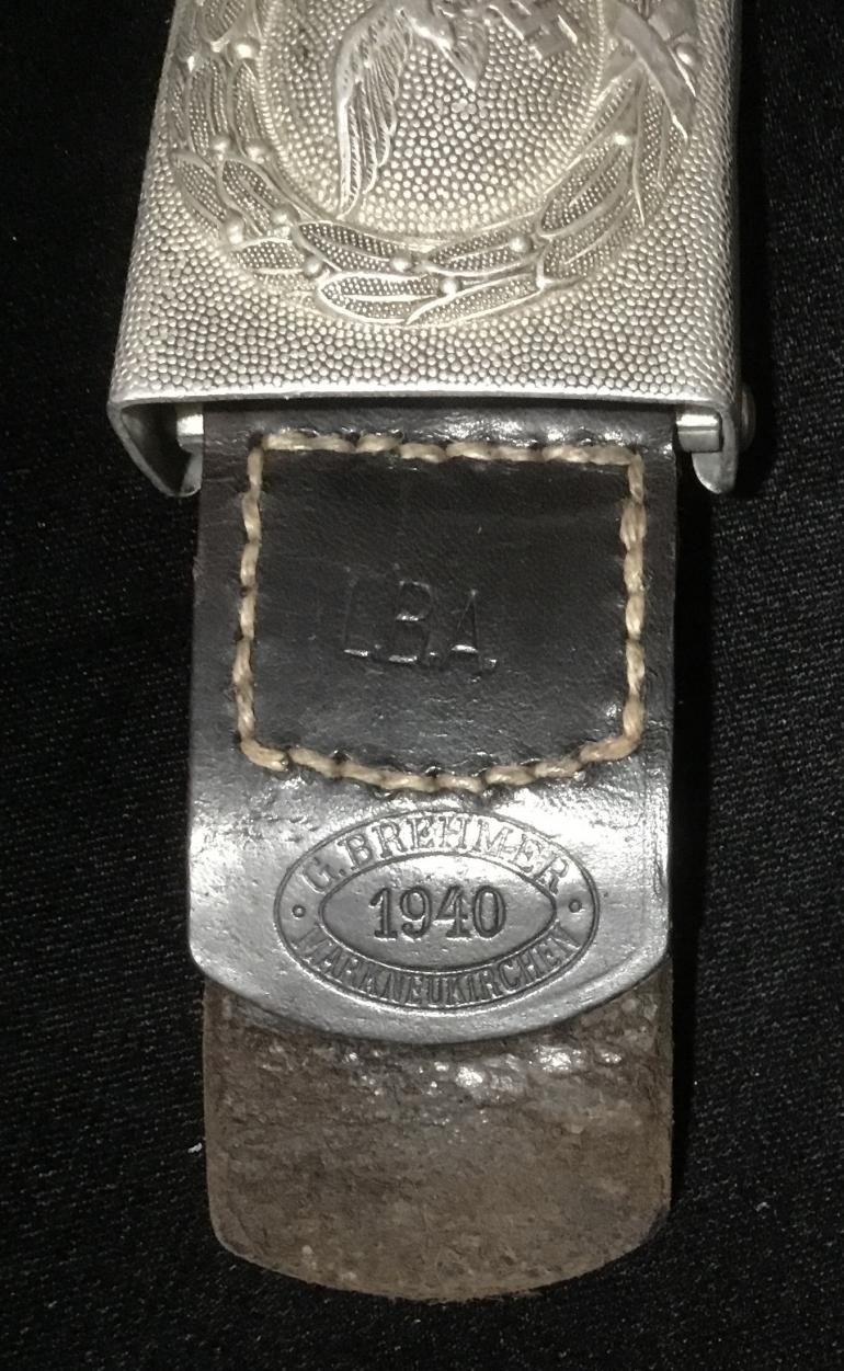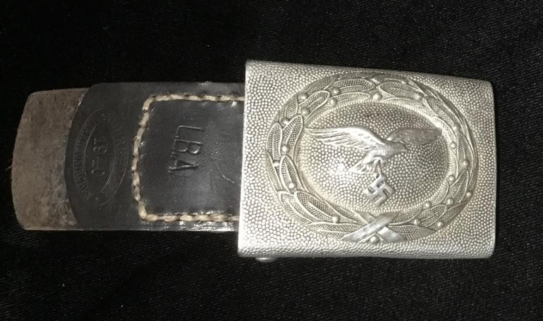 This is just a great Luft Aluminum buckle, the only wear to the front is to the eagles chest. The pebble background really highlights the eagle and wreath. The reverse has the intertwine G B initials for the mfg. G. Bremerton. The leather tab has the Luft acceptance LBA, and the oval G. Bremerton dated 1940 stamped into the leather. The 110 size i[black belt has an unidentified oval on the leather tab holding the catch on the belt. There is a name cut with a knife tip that with my eyes I cannot make it out. The belt itself is very supple and could be used today for years to come.