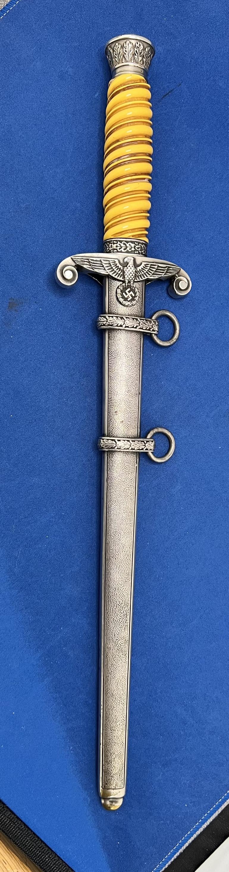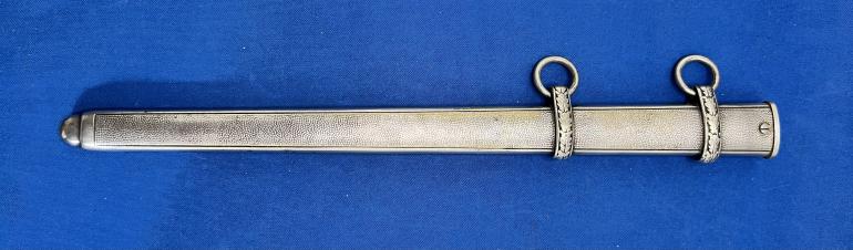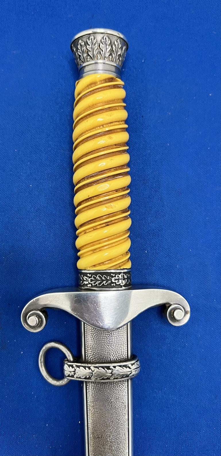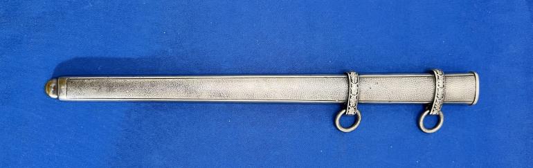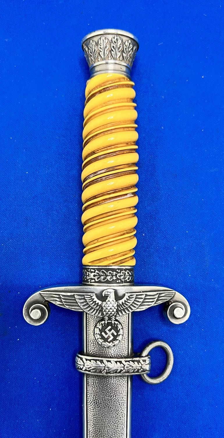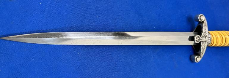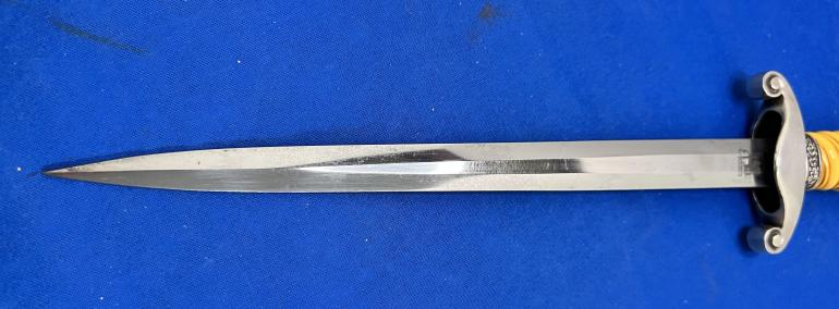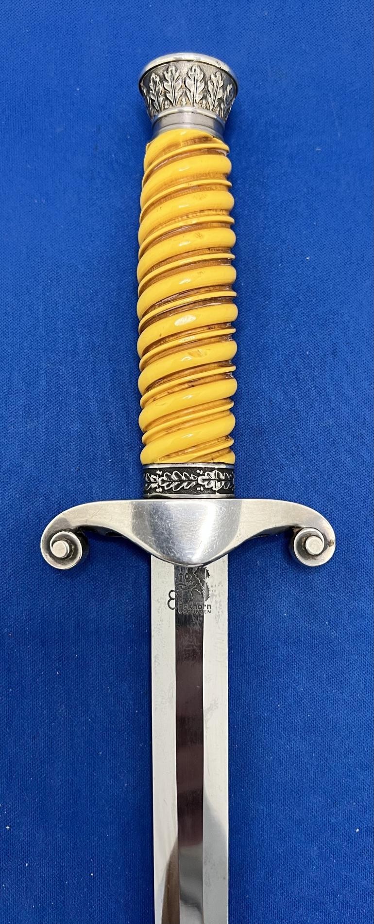 This is just a really nice early Eickhorn Army Dagger that has not been cleaned in years. You have to love the highlighted groves in the grip, it really says look at me. All metal,fittings are nickel silver. The pommel and eagle cross guard castings are very sharp in detail. The scabbard has some minor dings on the lower top and bottom (not the sides) and are something you have to look for. The blade should be polished to take off an old finger print.