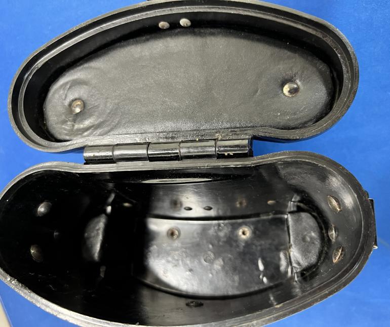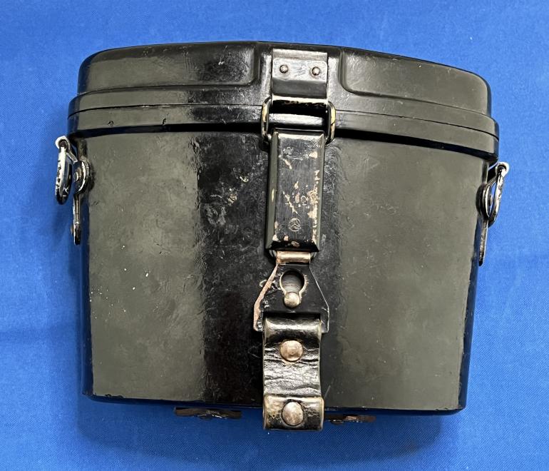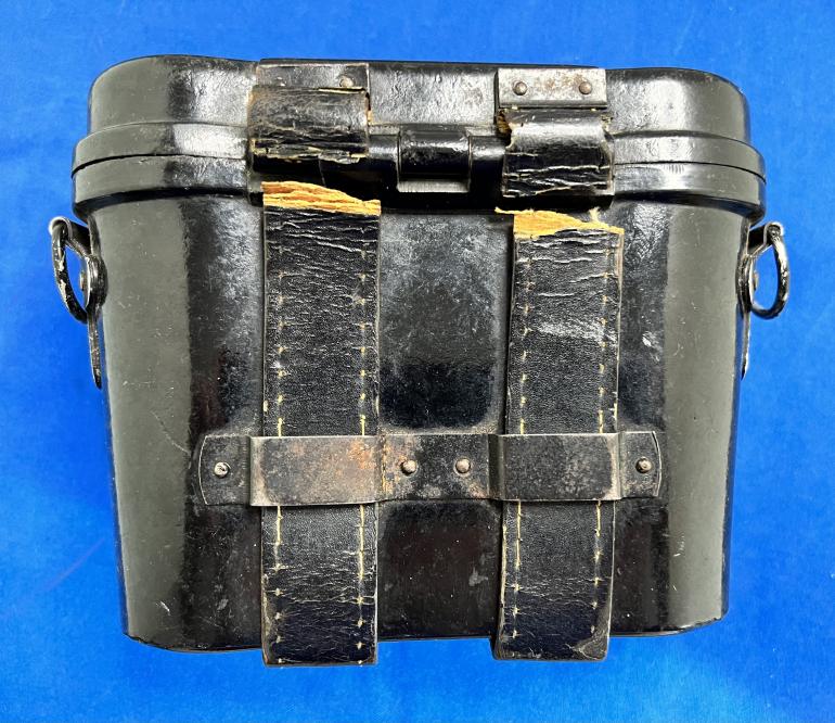 This is a neat combination of a WWI production Carl Zeiss, Marineglas in a WWII Bakelite case. This set was brought home by a US Soldier. The glasses are marked Carl Zeiss Juna on one side and marineglas 506310 6X. The exterior original paint would rate in the high 90%. The artificial black leather wrap is complete. The eye shades are complete the individual focusing of each lens works. The glass is clear no fogging or gray areas.The right hand lens has the horizontal grid markings. Again the glasses are clear with no problems. There also is a attached rain cover for the lens. The Bakelite carrying case is the normal black red finish. The front draw catch is complete with the leather pull strap. There is a small circular stamp on the bottom of the case but I cannot read it. The two leather? straps for mounting on the belt are separated by the rear hinge. One strap has a Waffen amp if you look real close I think its neat having the old binoculars with the new WWII case.