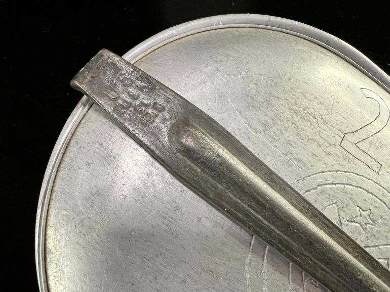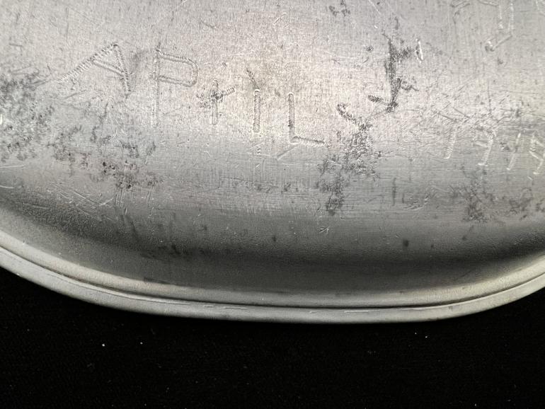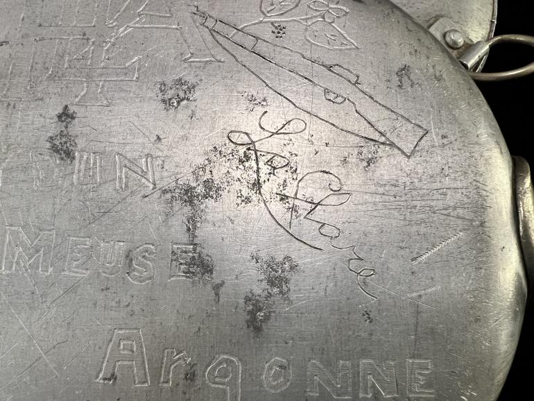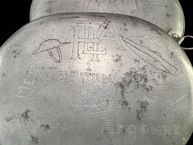 I haven't had one of these WWI personalized mess kit in a long time. The top cover is engraved with the number 27 and under it a copy of the 27th patch followed underneath with Div. The cover is great enough but the outside bottom of the kit is just as neat. The kit has the initials H E A engraved with a U.S. helmet on the left side and a rifle on the right side. Under this is engraved Verdun then Meuse and then Argonne. On the lowest portion is engraved April 1919 (must have been an occupation soldier). Also engraved is the word Metz, Montsuks and on the other side La Clare. A neat mess kit, I wonder if he showed it to his wife or girlfriend when he came home,