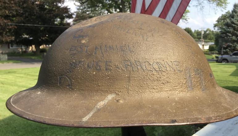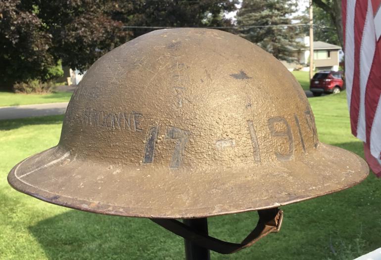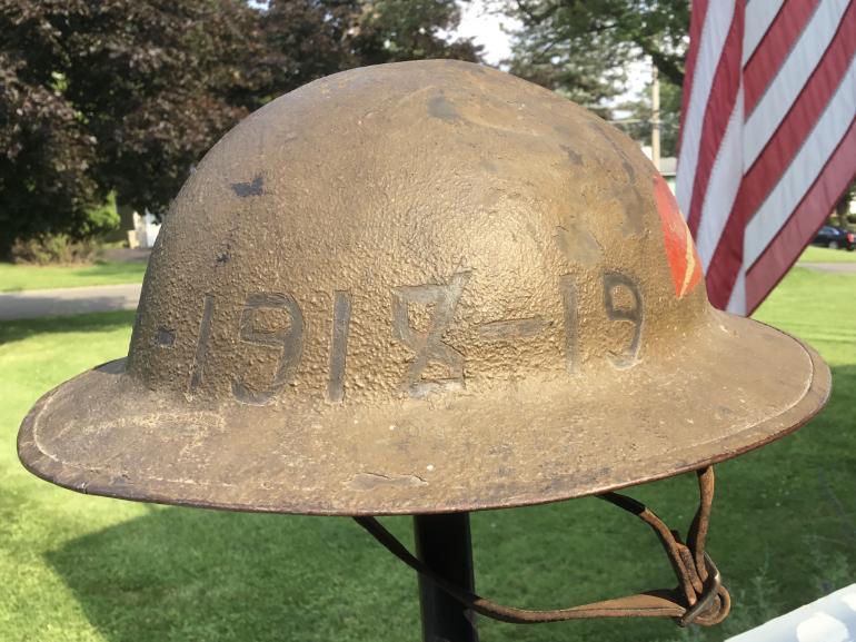 First off this M1917 helmet is complete with the full liner and chin strap. The 78th Division patch is painted on the owners left side and would rate 90%+. The front of the helmet has the following scraped out of the textured paint and painted black 17-1918-19. The right side of the helmet has scratched out of the paint and Chateau-Therry and that is painted black. Under that is St. Mihiel. Under that is Meuse- Argonne There is other writing that I can not make out. This work was done by a regular soldier not an artist. The top of the helmet has four big dents most likely from flying objects from a near artillery hit, just what they were intended to do.