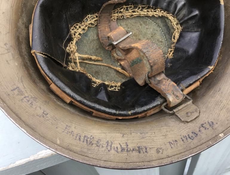 The entire underside skirt has been repainted in a heavy paint. On the left side of the underside skirt has the following painted on it 1st Bn. Pvt. Harry _ Hubbard No, 1763_ _6
