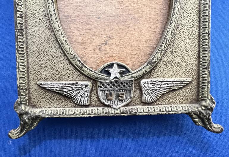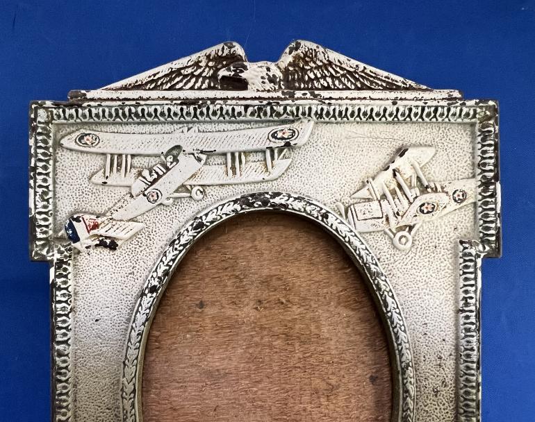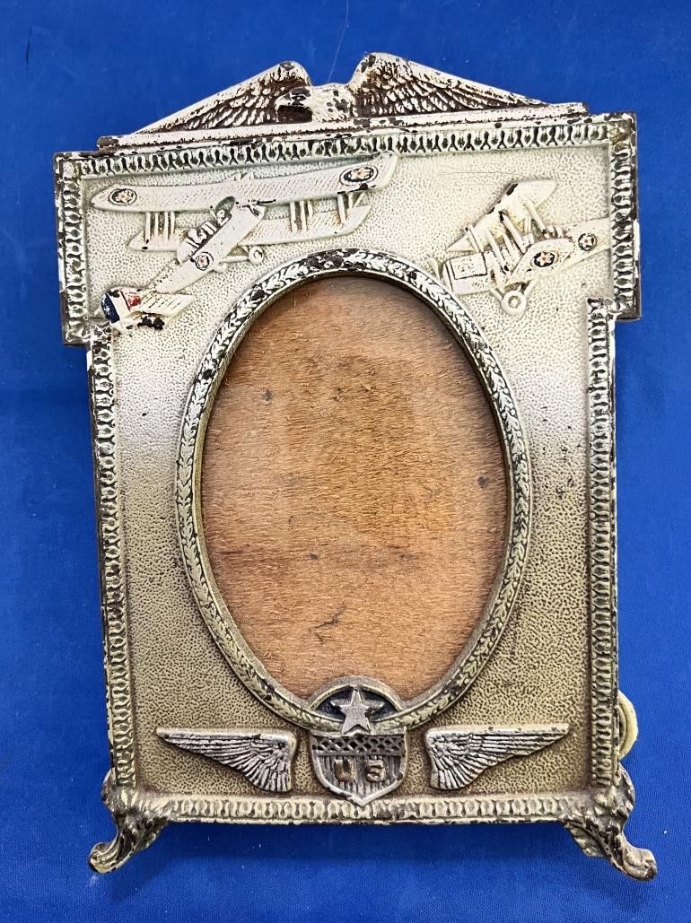 I have had this Rare Aviation metal photograph frame for over 40 years. Always thought I would find a nice pilot's photograph to put into it. I have found some but would not cut it up to fit this frame. The top of the frame has an eagle with spread wings and under that two Bi-planes with the US Star in a circle on the wings and fuselage. This portion of the frame is sprayed a white/cream finish to show them flying in the air. The bottom of the frame has a Star and under it a facsimile of the early pilot wings. The reverse has a fancy movable bar to hold the frame up. If you are not familiar with the series of WW1 military frames they are made of heavy steel and are really great looking. I have other frames for Infantry and Calvary some place. Frame size 8.5” H x 5.75” W