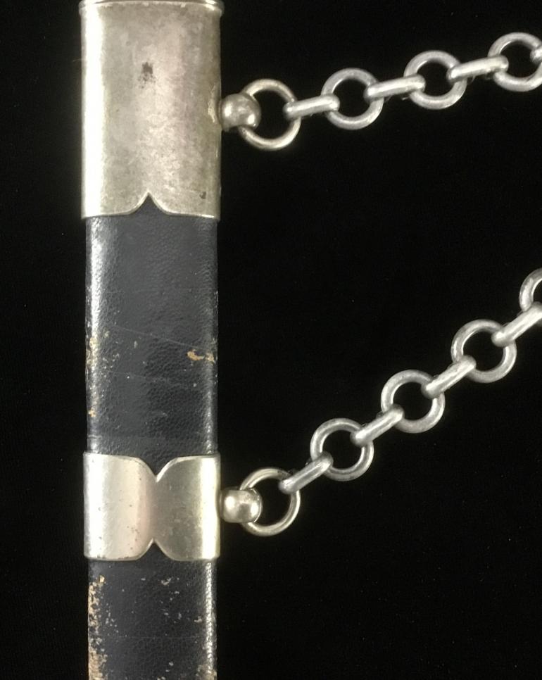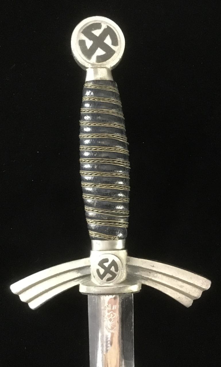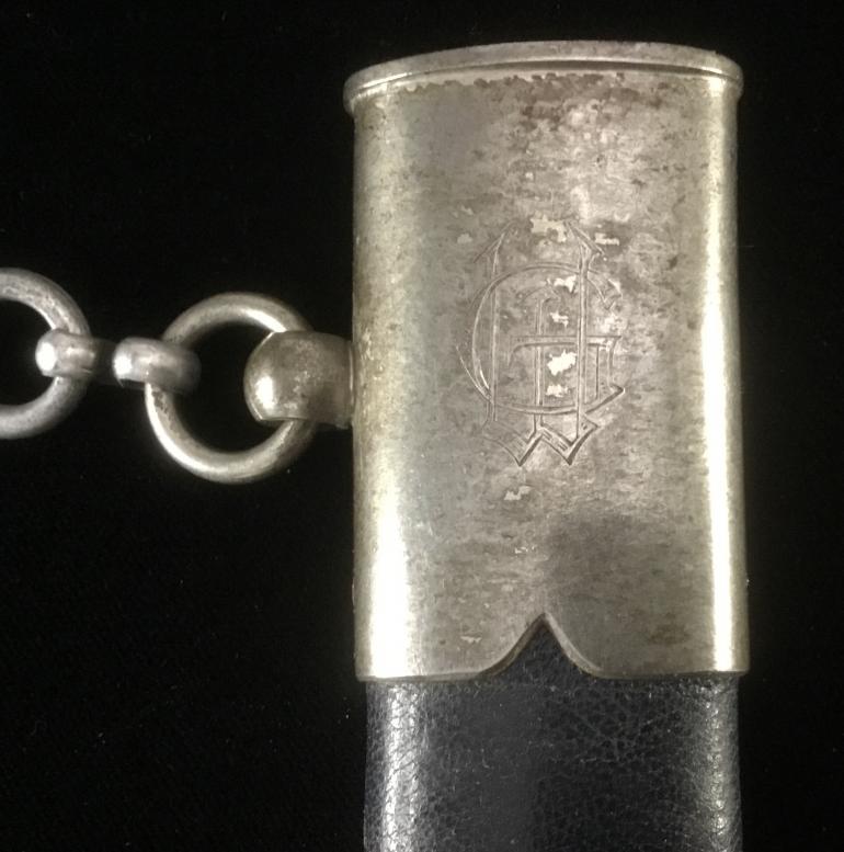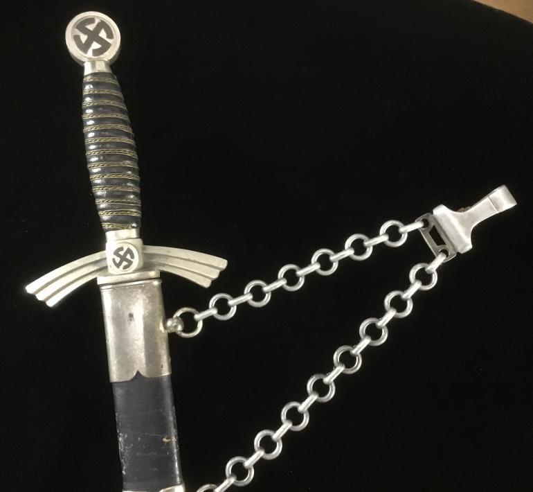 This WKC 1st model Luft Dagger with the owns initials engraved on the reverse of the upper scabbard fitting. As usual I will start with the Pommel, the Swaz's are black instead of the wash gold finish. It appears that someone applied a charcoal black paint that looks rather nice.The leather grip is is complete with the correct wire wrap assembly with no nicks. The Cross Guard is like the Pommel painted black Swaz's. Next is the blue leather buffer pad again complete and functioning. The Blade is with the WKC initials and the helmet knight. The chrome blade has the typical runner marks and unfortunately the tip has a slight bend in most likely another knife thrown at the wall. Overall a good looking blade.The scabbard blue leather cover would rate in the high 90%, with some loss of color along the edge. The hanger Chain is the full size Aluminum and the snap catch is maker marked on the reverse.