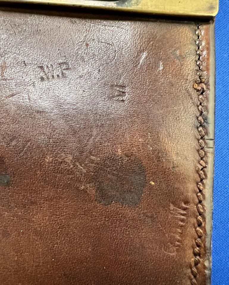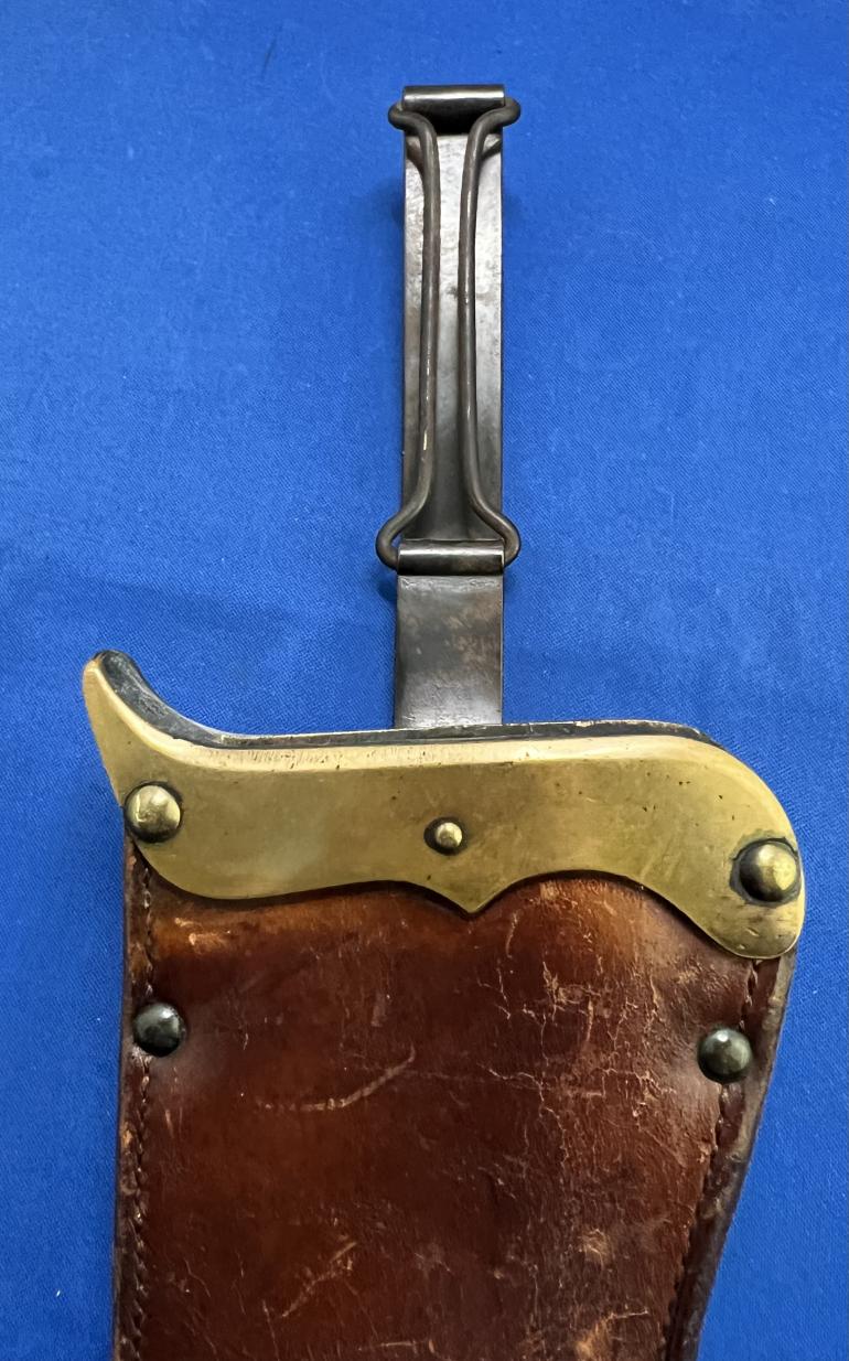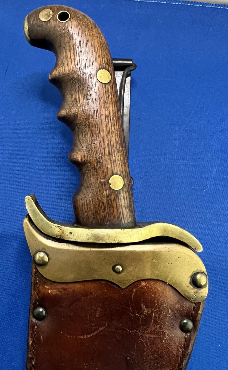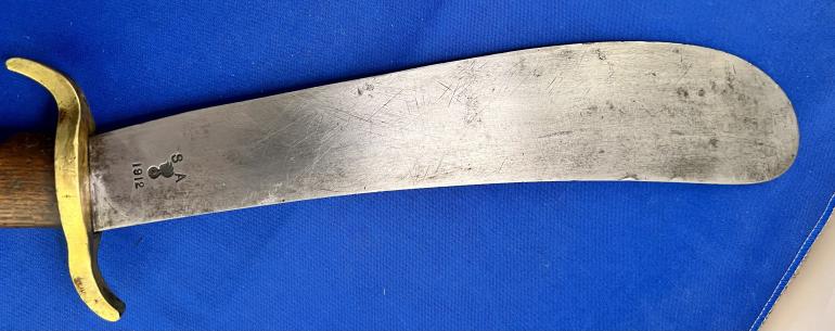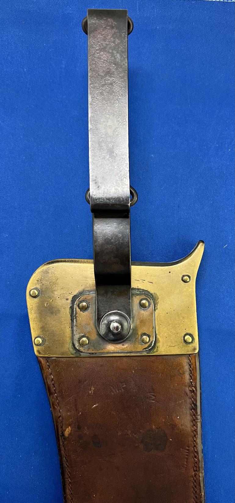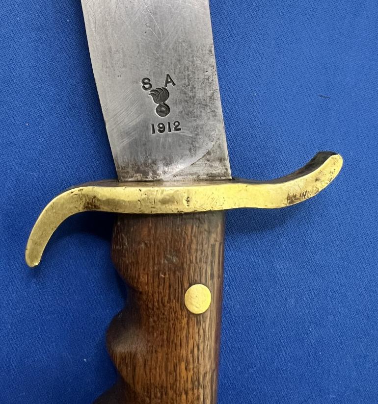 This monster U.S. Army M1909 Bolo knife was produced by the Springfield Armory intended for use in the Pacific Islands to clear brush and whatever else they wanted to use it for. This knife is just a very well made Bolo style knife that copied the knives used by the natives on the pacific islands. I will start with the grip, The grip is made with hard walnut wood, with a brass end cap (quite often missing) with two brass rivets holding the grips to the tang. There is a hole in the grip at the top to fasten a leather strap to it. The cross guard is again heavy brass. The blade at the cross guard is 3/8" thick and tappers to the rounded end. The blade is stamped S A over a flaming ordnance bomb and dated 1912.The opposite side has a U S and a serial number 23190. The blade has been sharpened and used. There are some very minor nicks to the blade edge. The Leather Scabbard like the knife is over constructed.The belt fastener is of the typical steel Krag rifle bayonet scabbard style. The scabbard throat is made from two heavy brass pieces with a plate holding the belt attachment. The brown leather is again heavily constructed with four rivets holding the throat and leather pieces together.The reverse is stamped ROCK ISLAND ARSENAL 1912 with inspectors stamp HEK. There is also the letters GHW stamped up by the cross guard. Then there are the letters WP stamped above the GHW. Seems that too many people approved this scabbard, it must been a government job. This is a early well inspected set that is getting harder to find at a reasonable price.