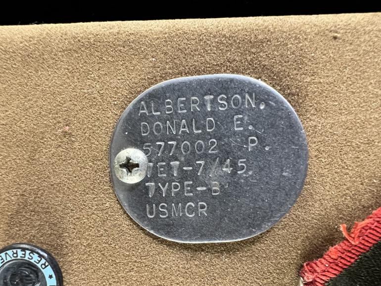 This USMC group is identified to Donald E.Albertson Service no.577002. The group includes two sets of collar EGA's and one Cap EGA screw back insignia.One pair of Dog Tags to Albertson listing his tet shot and blood type.There are also two Marine reserve enamel pins. One green Private rank and a two dress red border private rank. There is also a red letter P 2" high and I do not know what that is for.