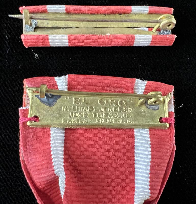 This Philippine Defense Medal is an early one with enamel on the wreath around the obverse and the reverse is stamped Bronze, its not one of the cheap knock off medals from ebay. The Slot broach has the Philippine makers full name impressed into the back plate. The ribbon bar has a pin and catch attaching not the clutch back pins.