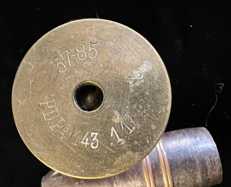 This French 37mm Shell Case with the Dewat Shell. The base of the shell case is stamped with following 37-85 refers to the cal. 37mm the 85 is the cannon model. The shell casing was made in Jan, 1917 by Parc d Artillerie de Paris. The flaming bomb acceptance stamp is present. The Shell and the arming head are both stamped 2226. There are some additional markings on the shell that I can not make out. The brass rotating bands are as new showing that the round was not fired. The shell casing has MEUSE engraved or hand stamped in large letters. This makes a niece display something that you can put on your desk or with some medals displayed.