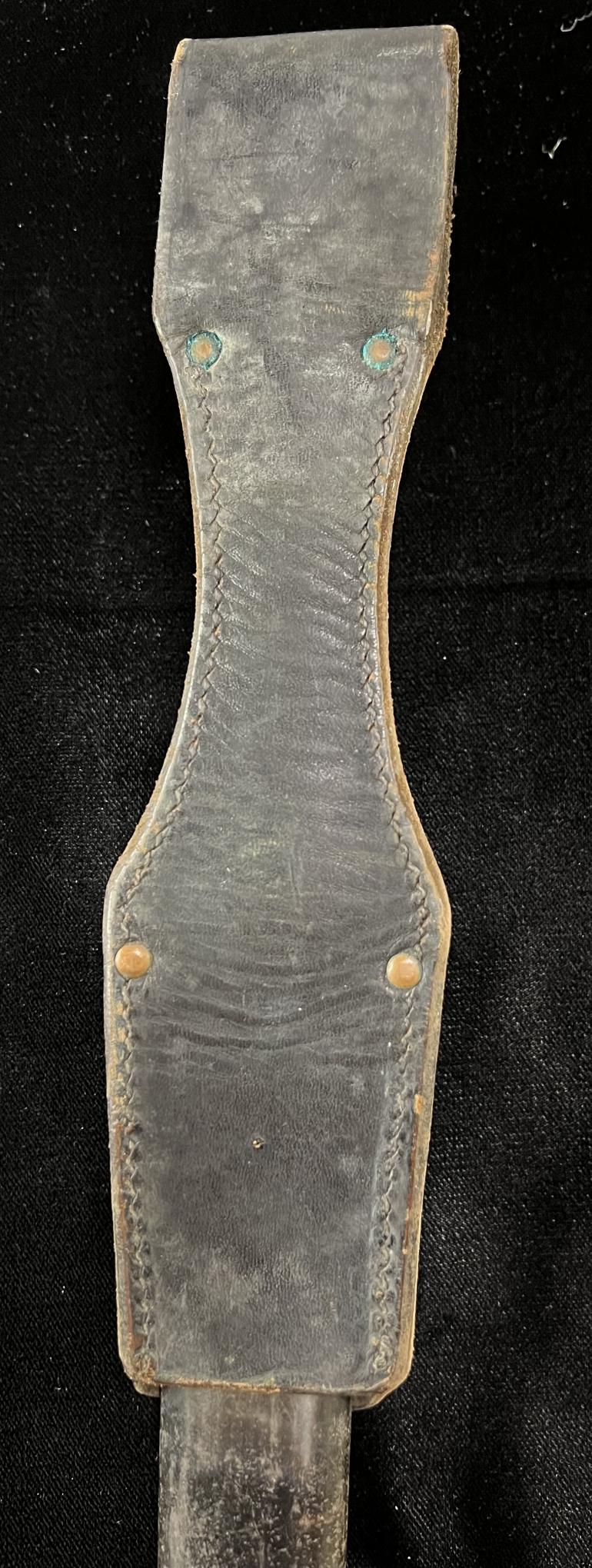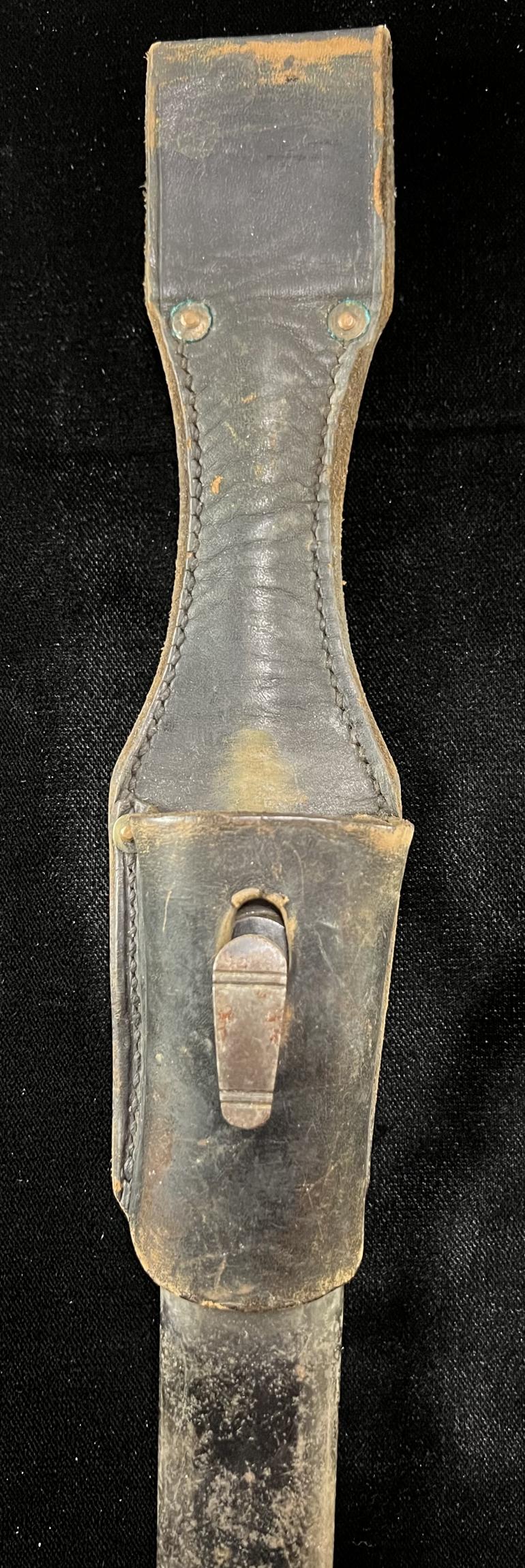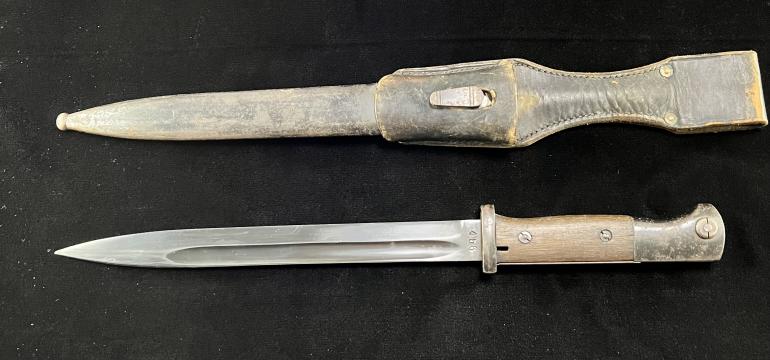 I purchased this mystery (to Me) K98 Bayonet at a local antique sale. The price was right, heck a K98 bayonet with a almost perfect blued blade a scabbard and leather frog all. I have to be honest I am not that knowledgeable with the common K98 bayonet. I believe that this is a refurbished item but yet there are things that it is lacking to just be reissued by some other country,